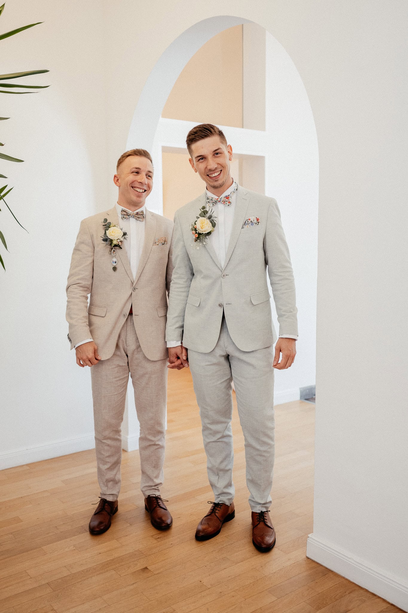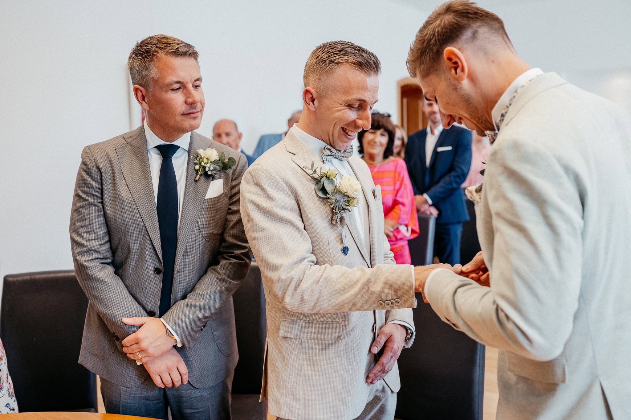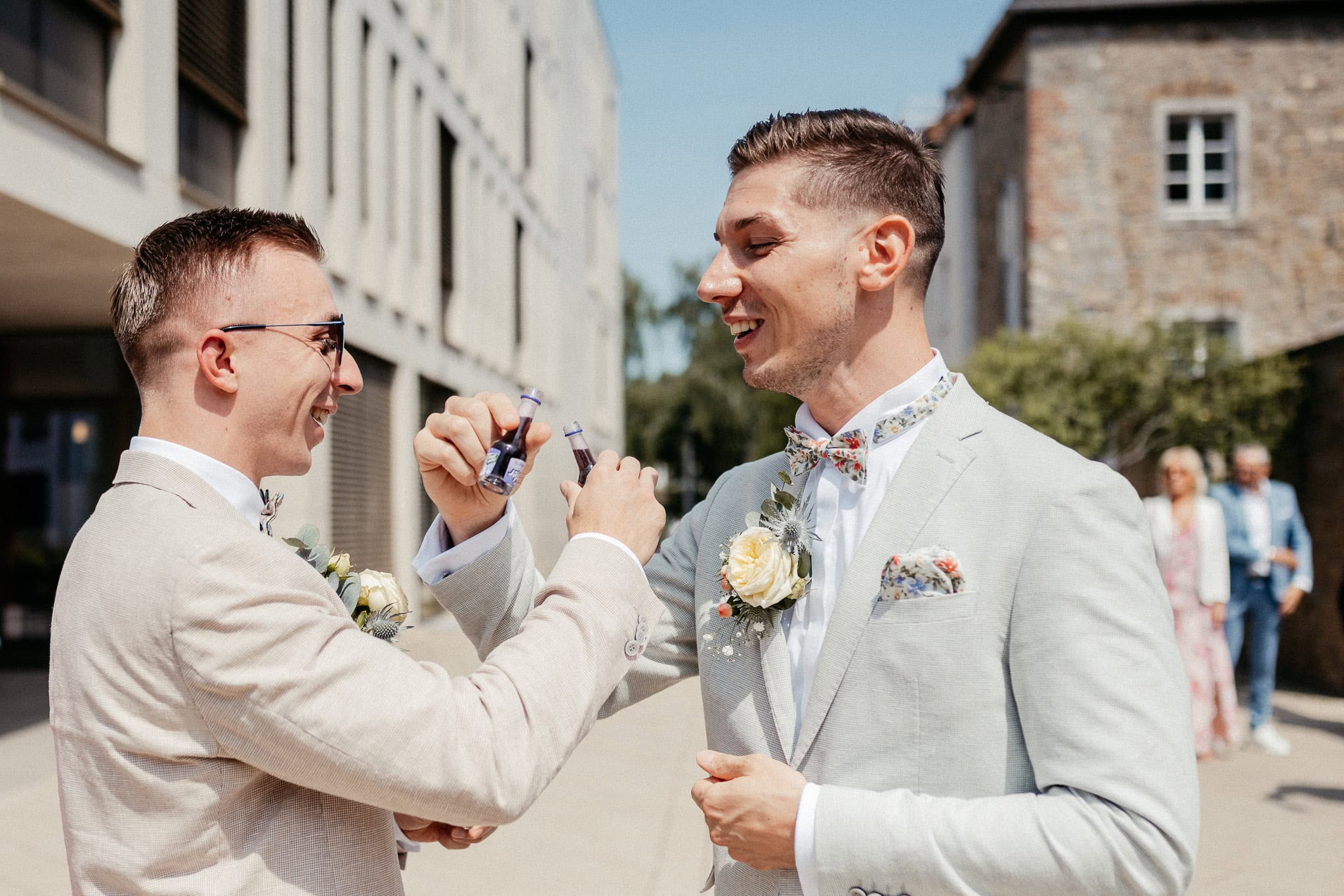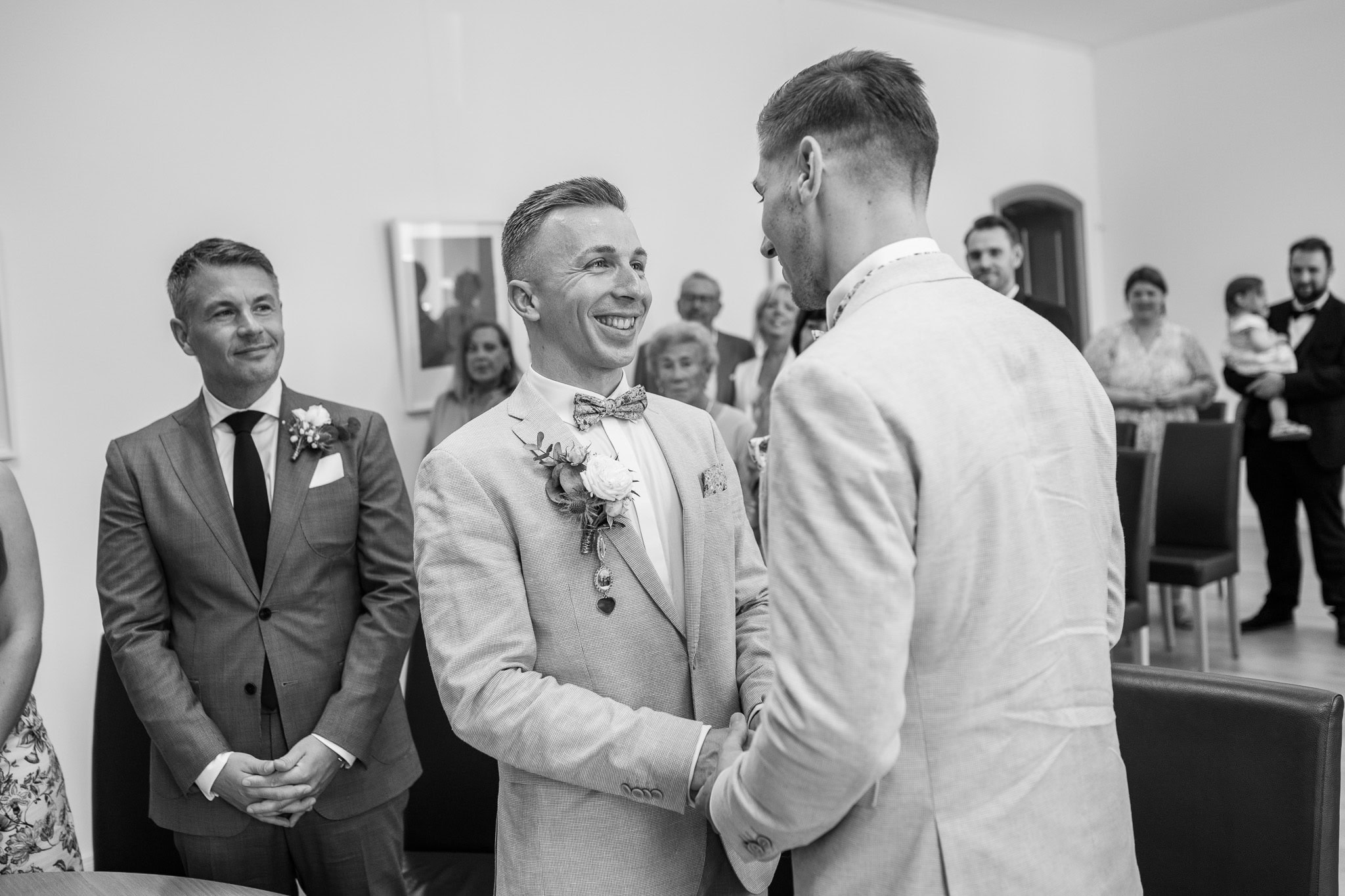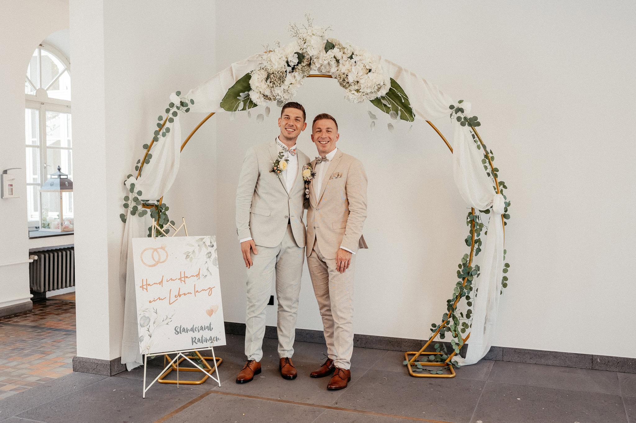 Die standesamtliche Trauung von Patrick und Kevin fand im historischen Standesamt im Minoritenkloster Ratingen statt. Schon beim Eintreffen der Gäste lag schon so viel Freude, Aufregung und Liebe in der Luft. Für uns, als Hochzeitsfotografen einer LGBTQ-Hochzeit war es ein Fest der Gefühle und wir haben uns gefühlt nur im Kreis mit der Kamera gedreht.