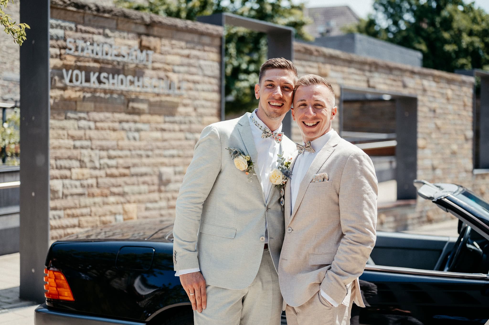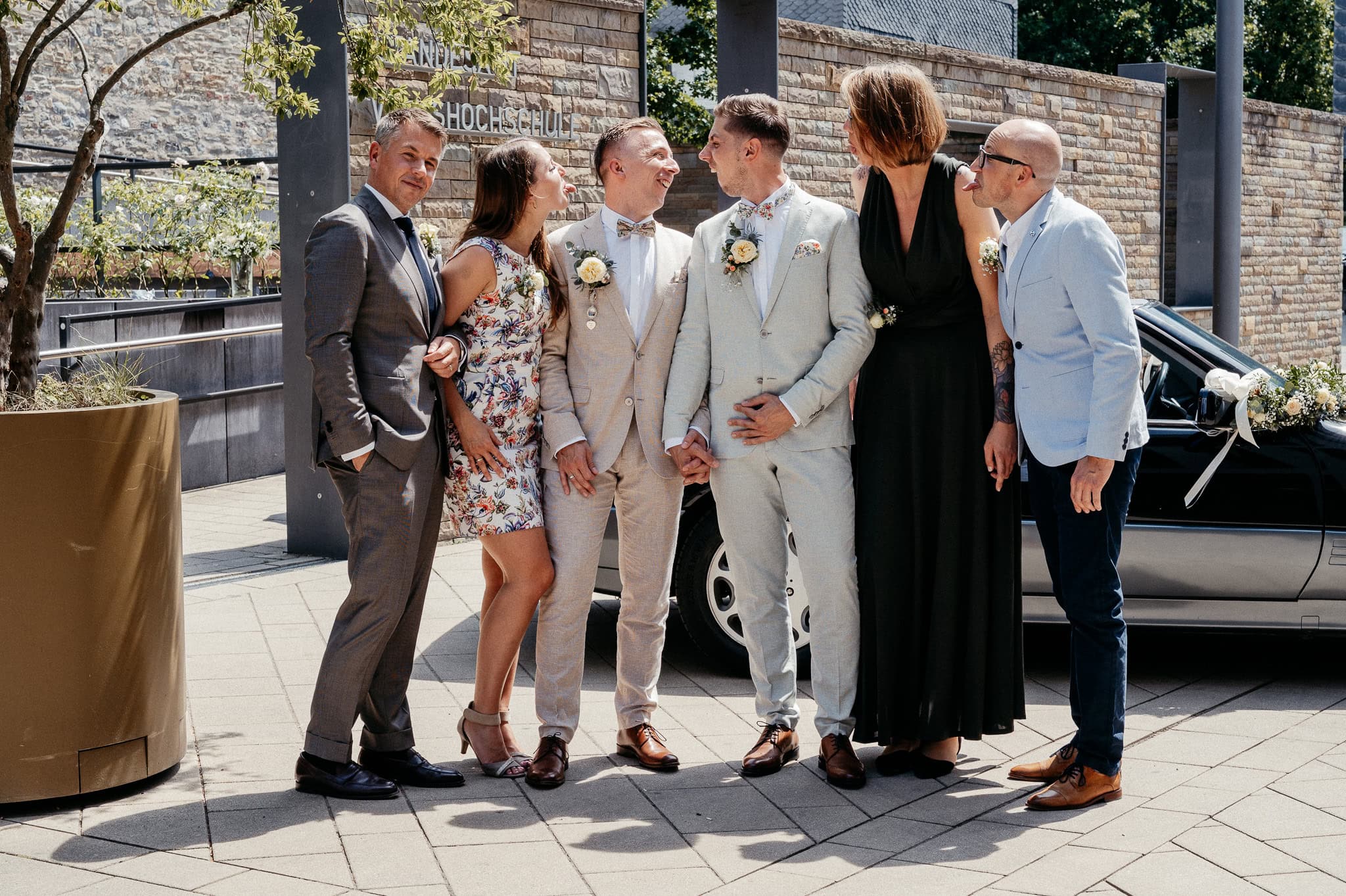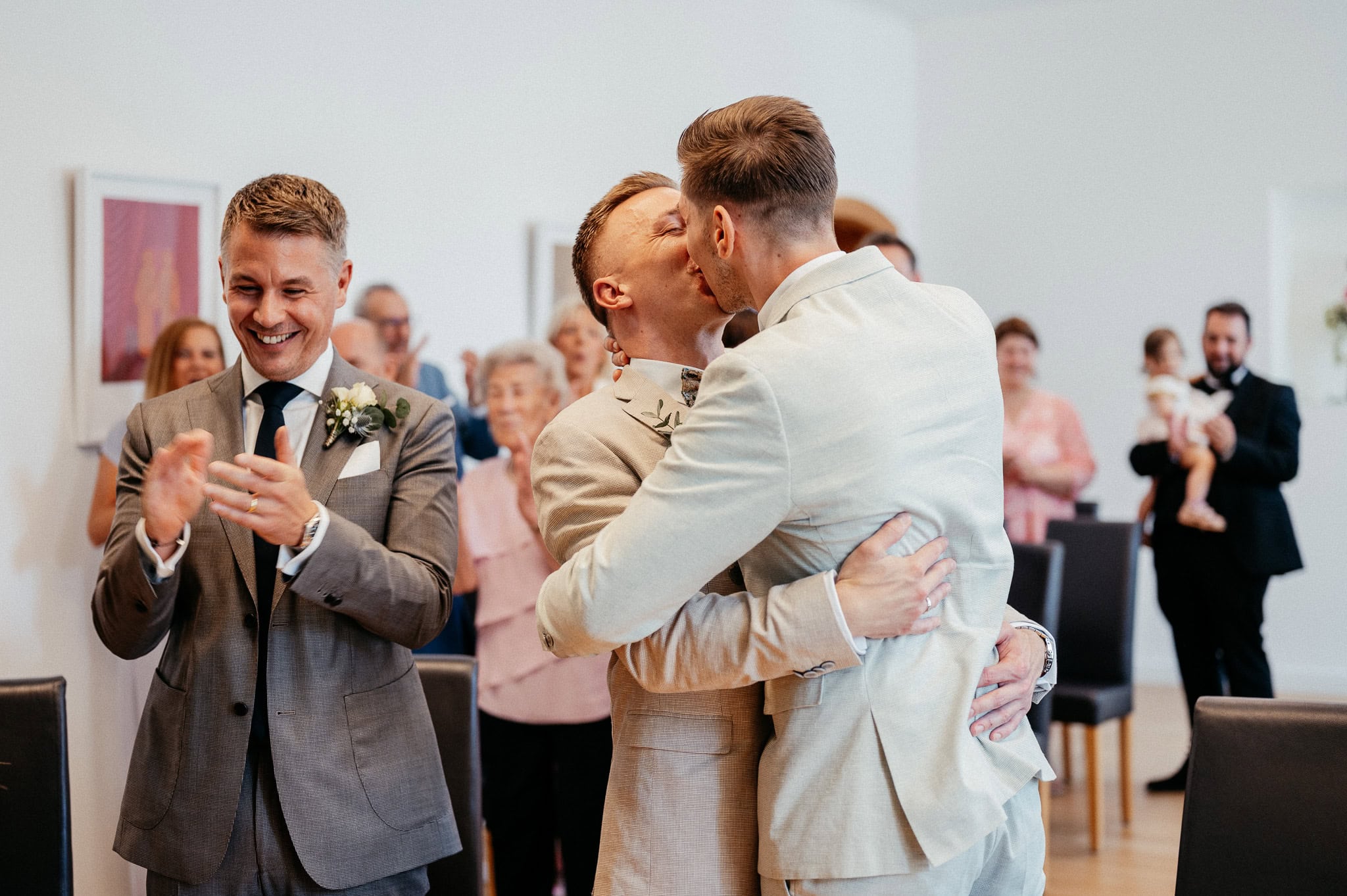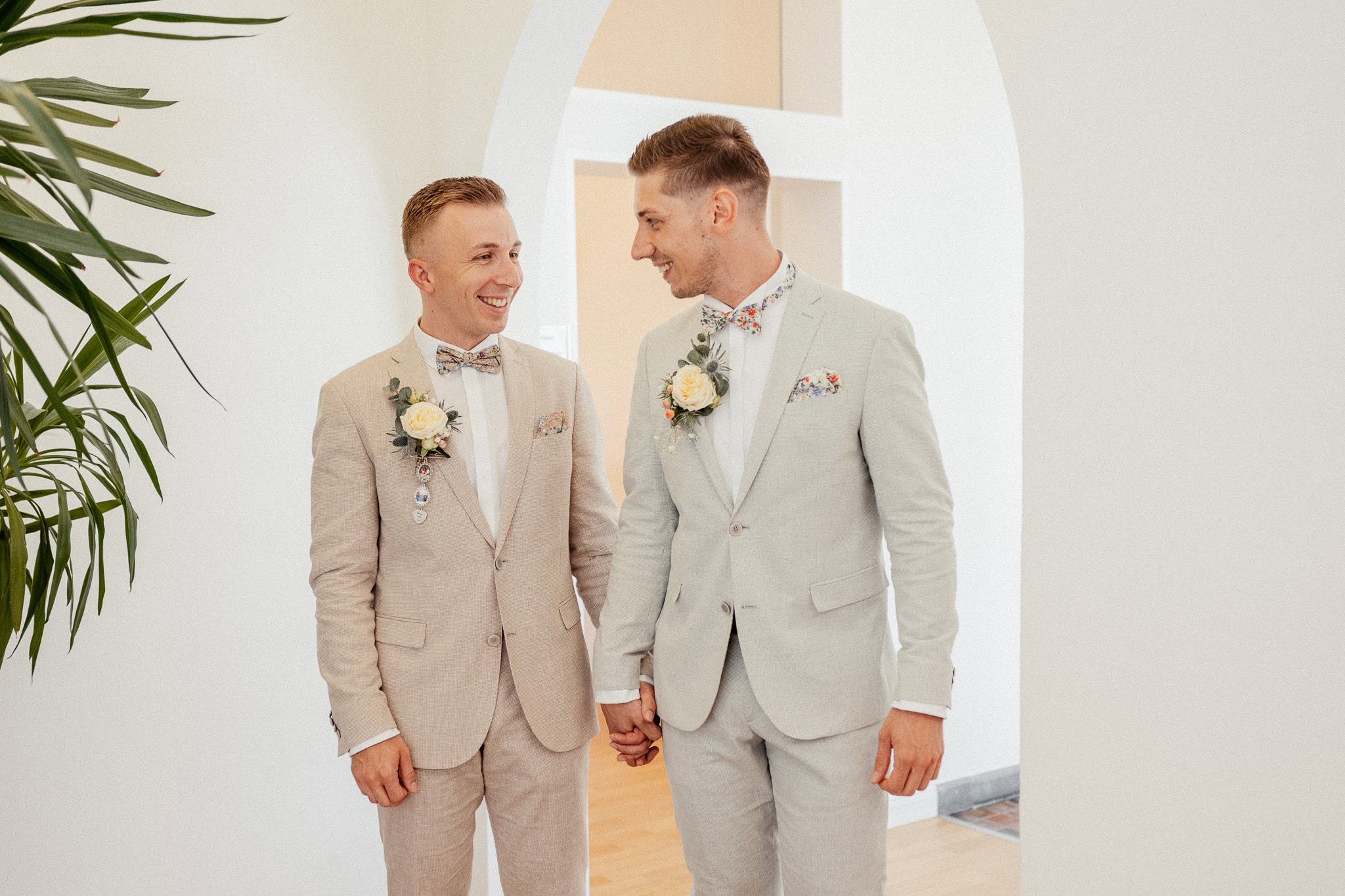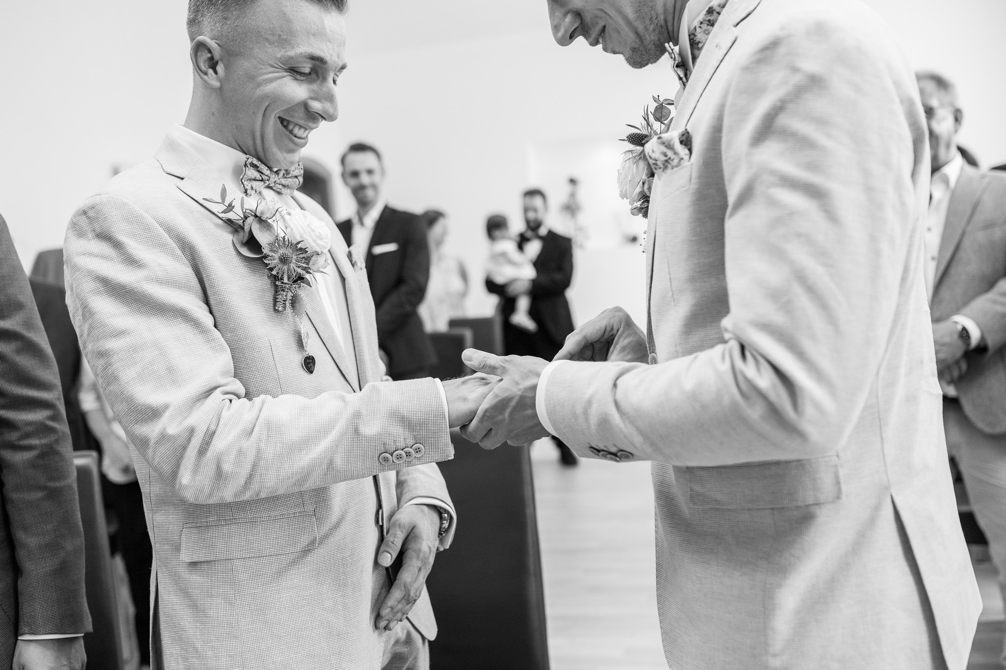 Die standesamtliche Trauung von Patrick und Kevin fand im historischen Standesamt im Minoritenkloster Ratingen statt. Schon beim Eintreffen der Gäste lag schon so viel Freude, Aufregung und Liebe in der Luft. Für uns, als Hochzeitsfotografen einer LGBTQ-Hochzeit war es ein Fest der Gefühle und wir haben uns gefühlt nur im Kreis mit der Kamera gedreht.