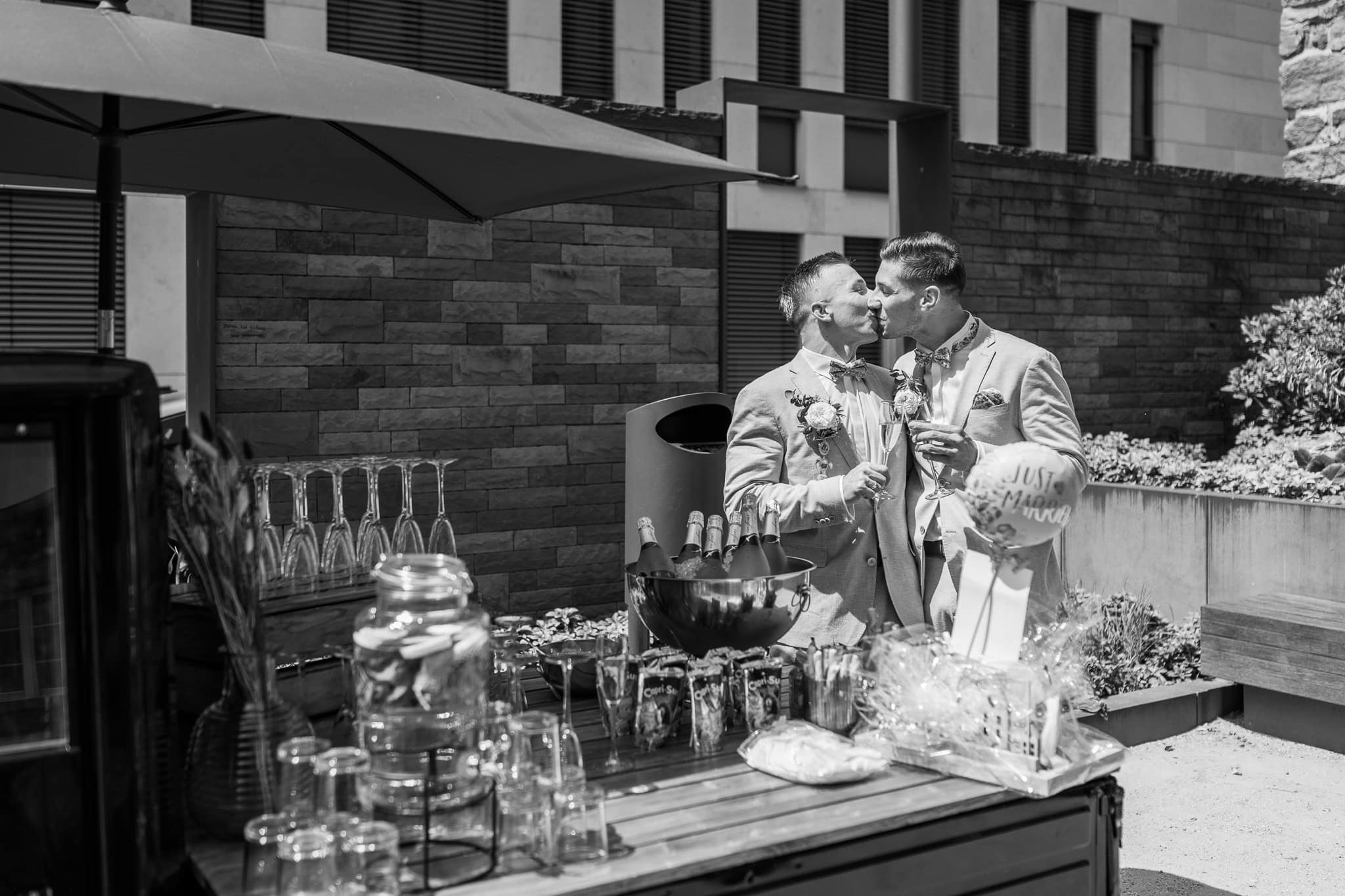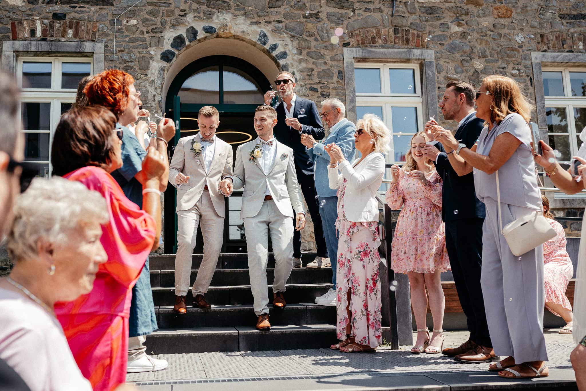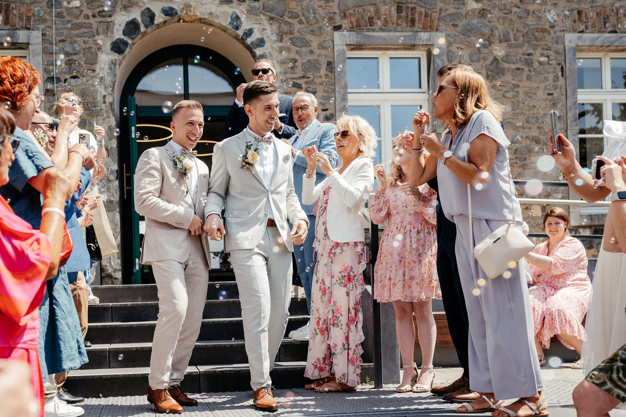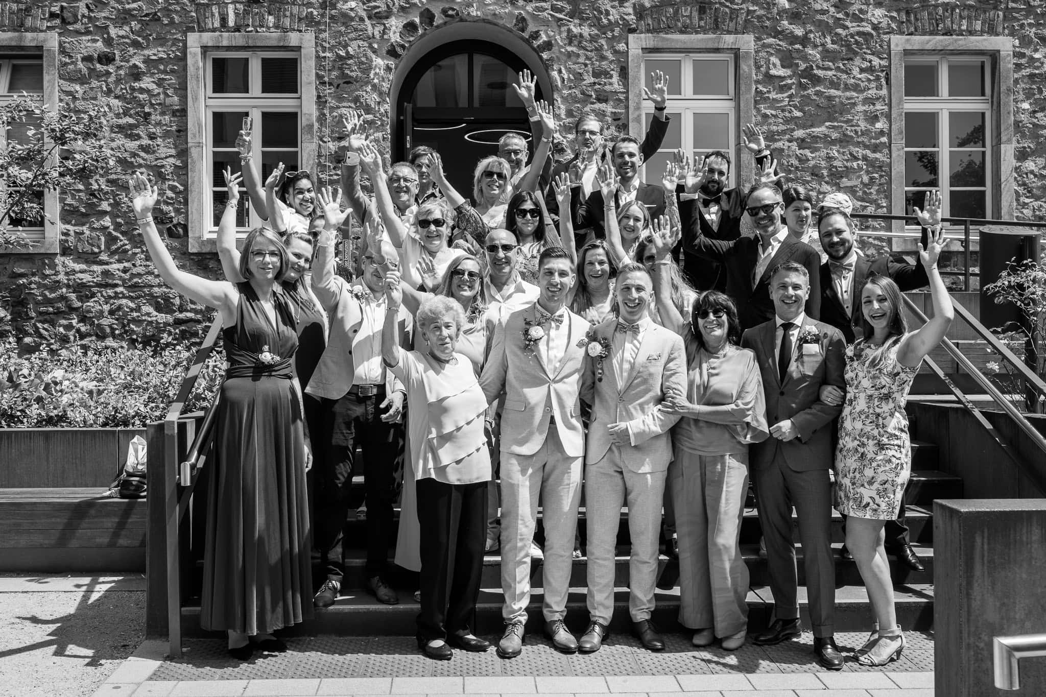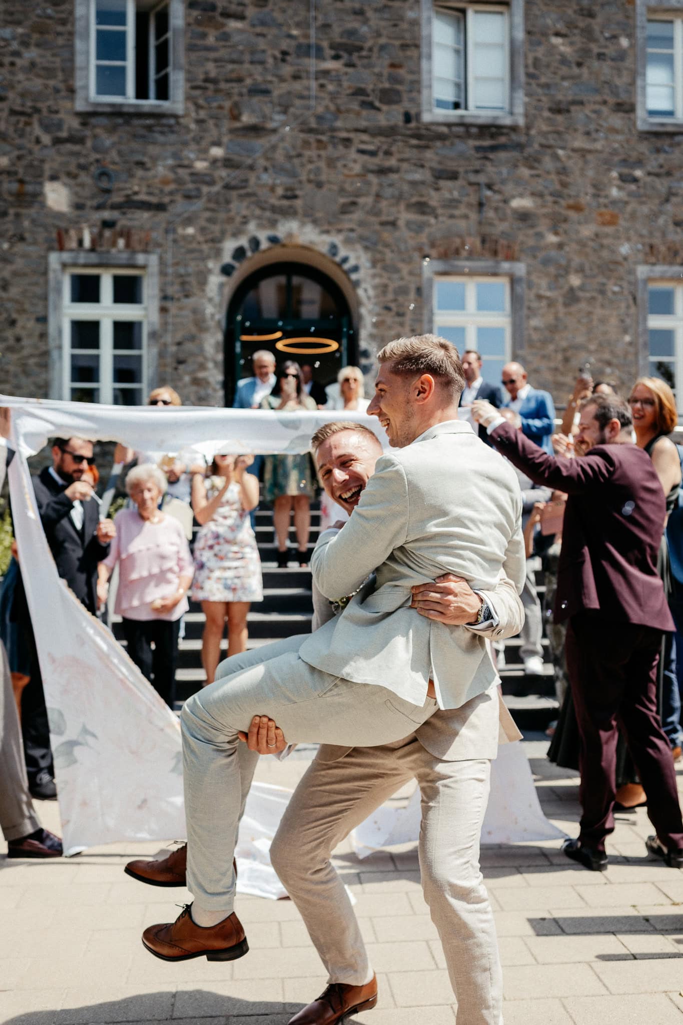Die standesamtliche Trauung von Patrick und Kevin fand im historischen Standesamt im Minoritenkloster Ratingen statt. Schon beim Eintreffen der Gäste lag schon so viel Freude, Aufregung und Liebe in der Luft. Für uns, als Hochzeitsfotografen einer LGBTQ-Hochzeit war es ein Fest der Gefühle und wir haben uns gefühlt nur im Kreis mit der Kamera gedreht.