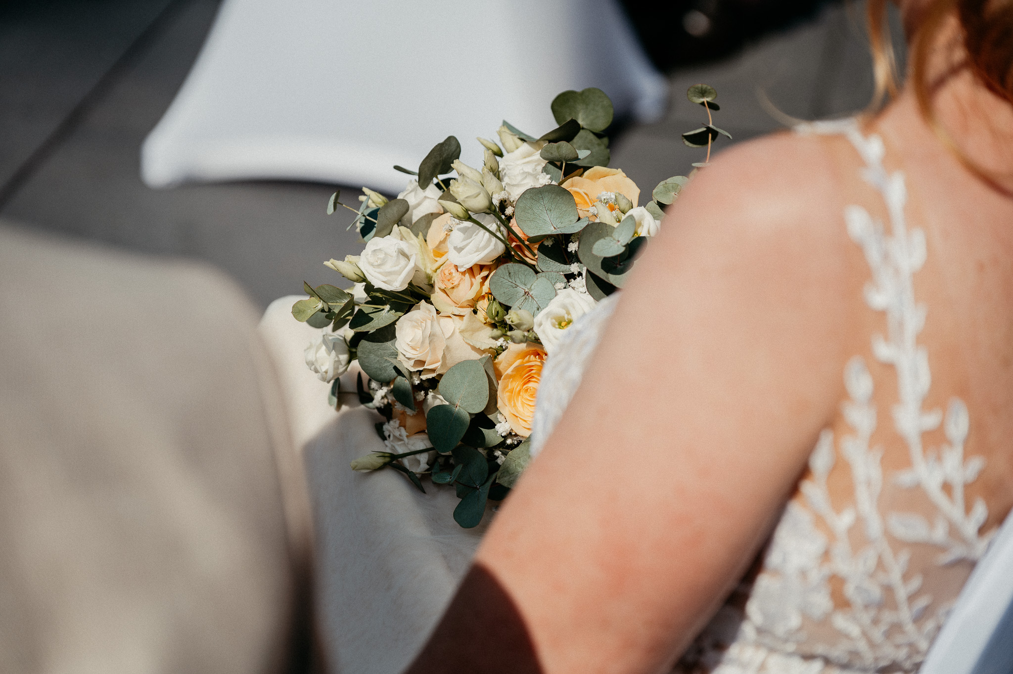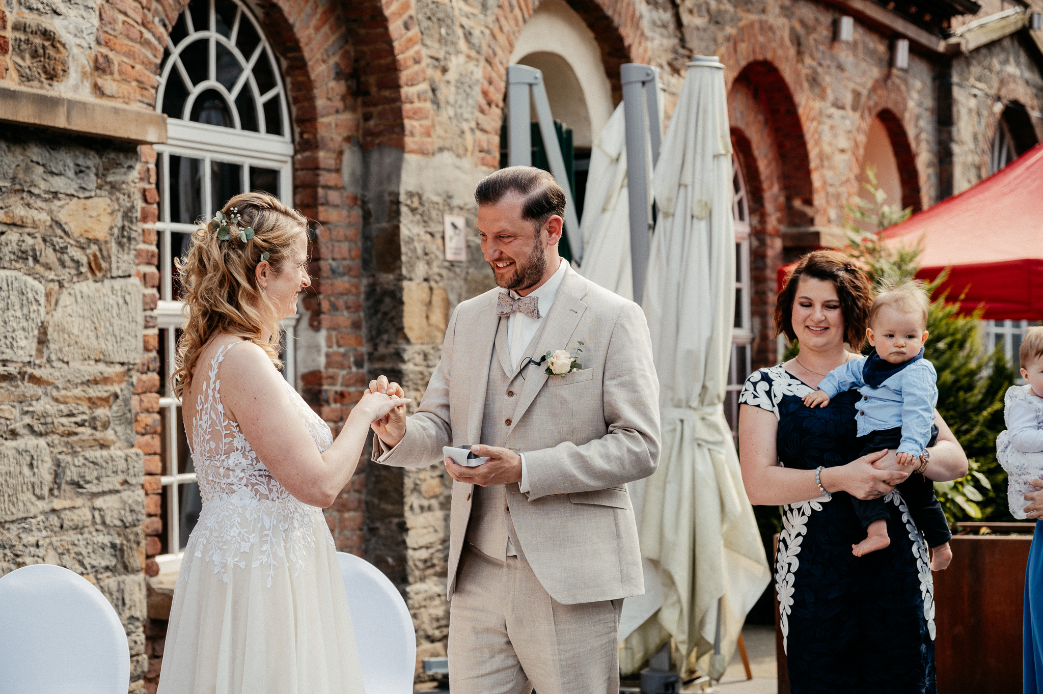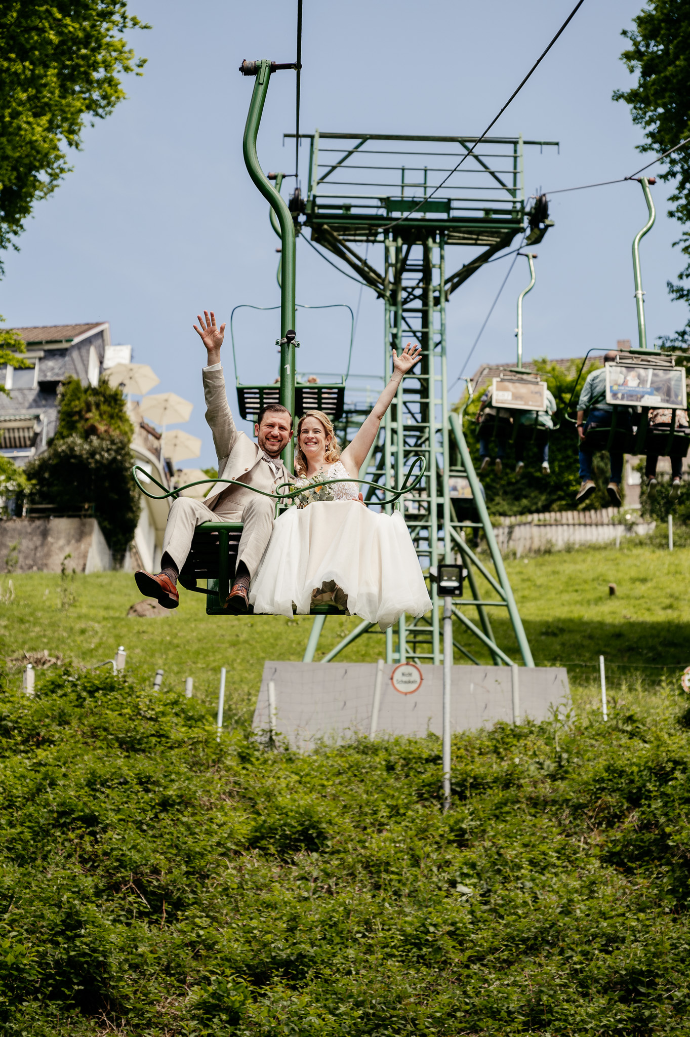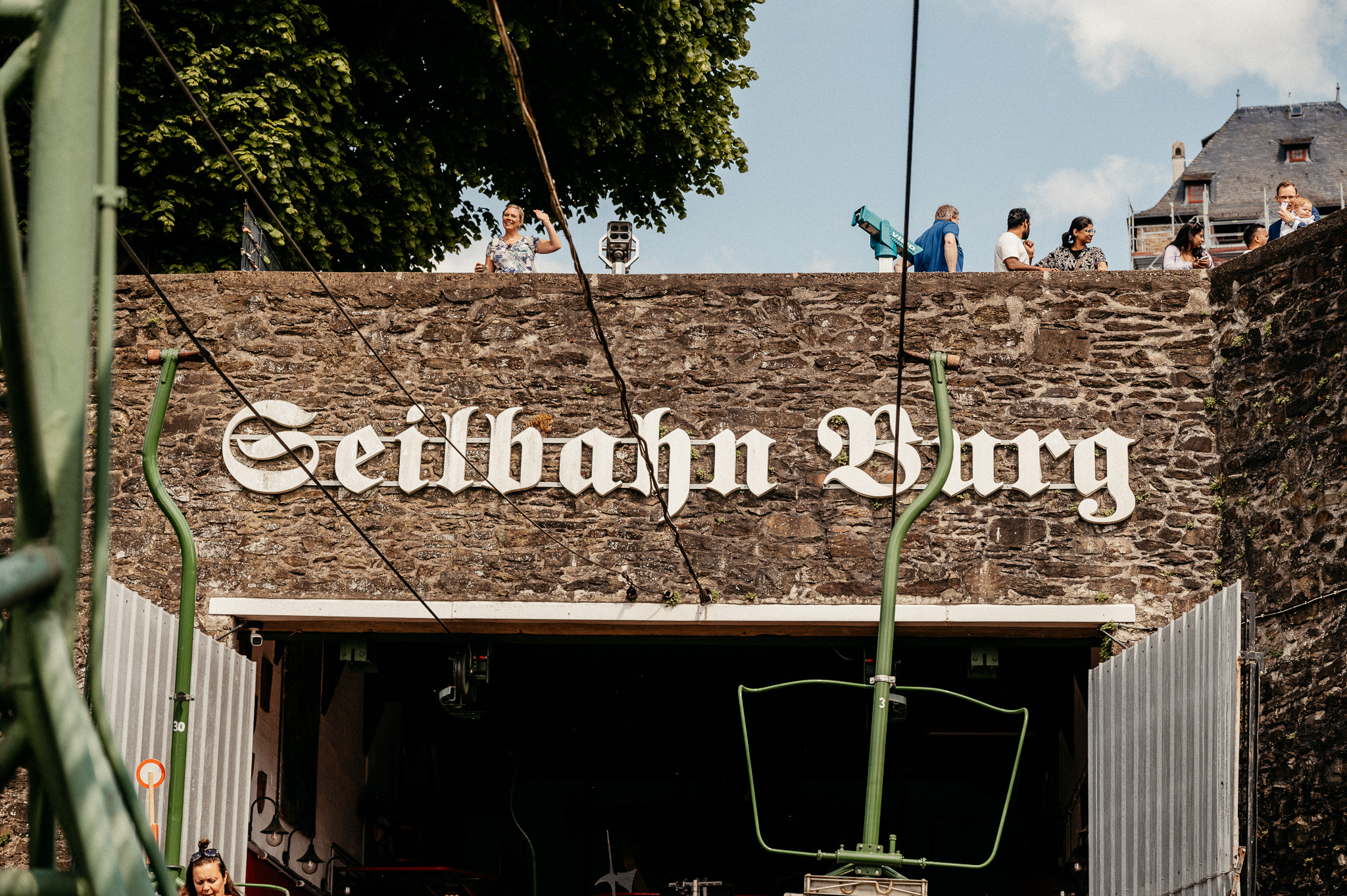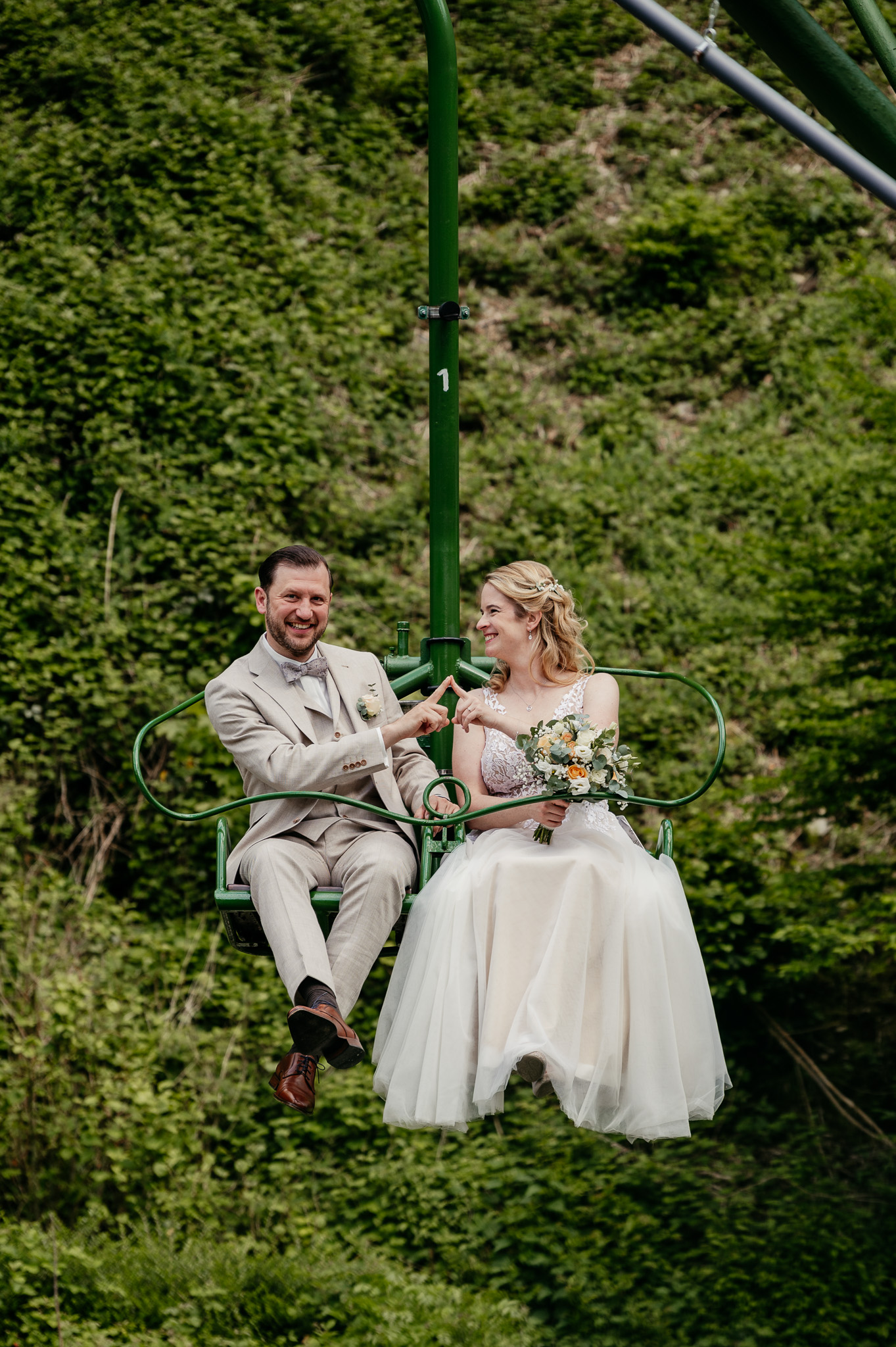 Neben der Schloss Burg gibt es eine Seilbahn, die uns direkt inspiriert hat. Mit ein wenig Mut und Abenteuerlust sind wir zusammen in die Gondeln gestiegen – die beiden als Hochzeitspaar und ich mit meinen Kameras hinterher. Während wir die Fahrt genossen, entstanden einige der lustigsten und zugleich emotionalsten Bilder des Tages. Für mich war das definitiv ein Höhepunkt, auch wenn ich kurzzeitig das Gefühl hatte, meine Kamera (oder mich selbst) aus der Gondel zu verlieren. Aber genau diese Momente machen den Tag unvergesslich – sowohl für das Paar als auch für mich als Fotografin.
