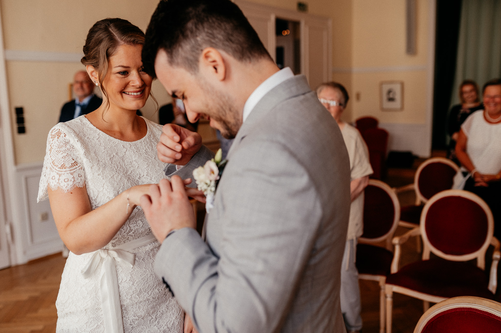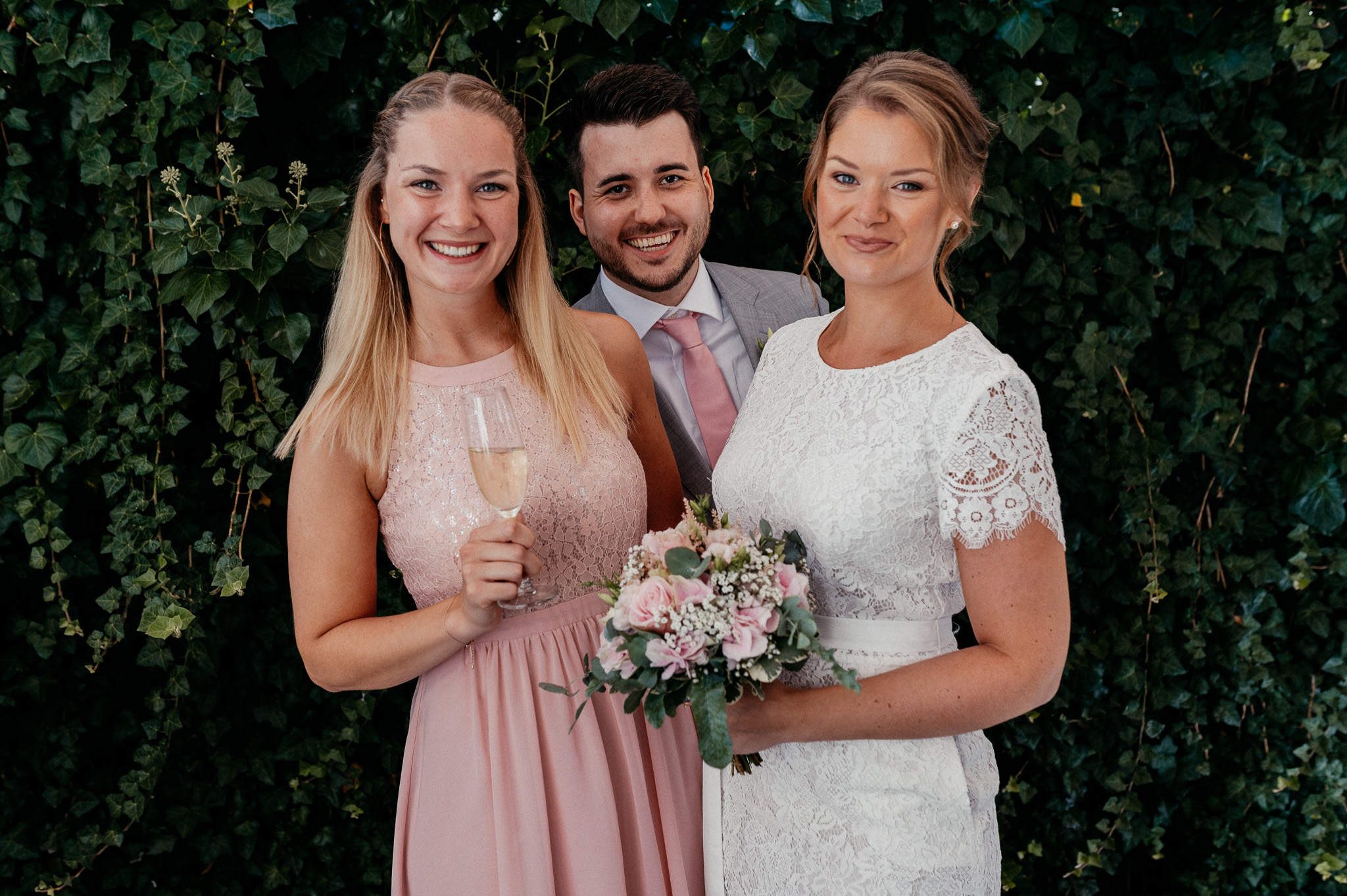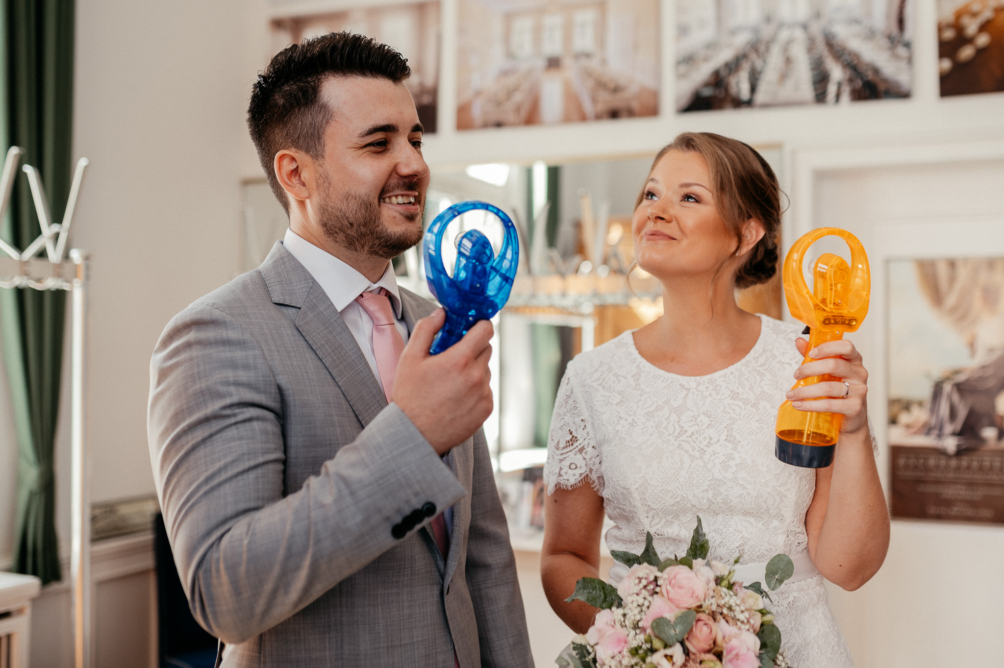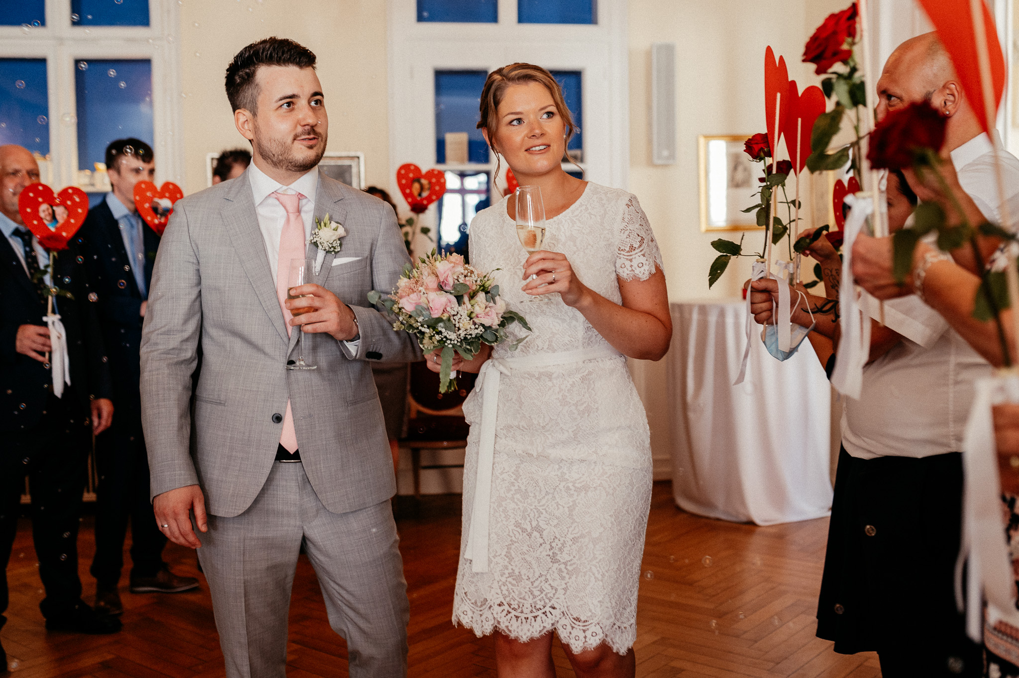 Eigentlich hatten die beiden einen anderen Plan. Aufgrund der Personenanzahlbegrenzung im Standesamt entschieden sich die beiden für die schöne Location in der Kulturvilla. Dort hatten Sie die Möglichkeit, den engsten Kreis der Familie mitzunehmen, da die Personenzahl zu dem Zeitpunkt bei ca. 20 Personen lag. Die Location bietet nicht nur die Option, sich dort trauen zu lassen, sondern auch die Feier direkt vor Ort auszurichten. Auf der Website findet Ihr alle Informationen. Eine wunderschöne Outdoor-Kulisse für den Sektempfang bietet direkt vor der Tür der schöne Hofgarten.