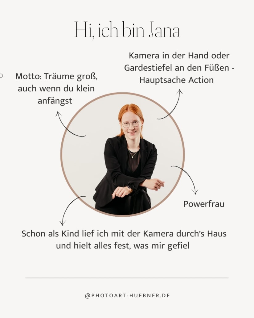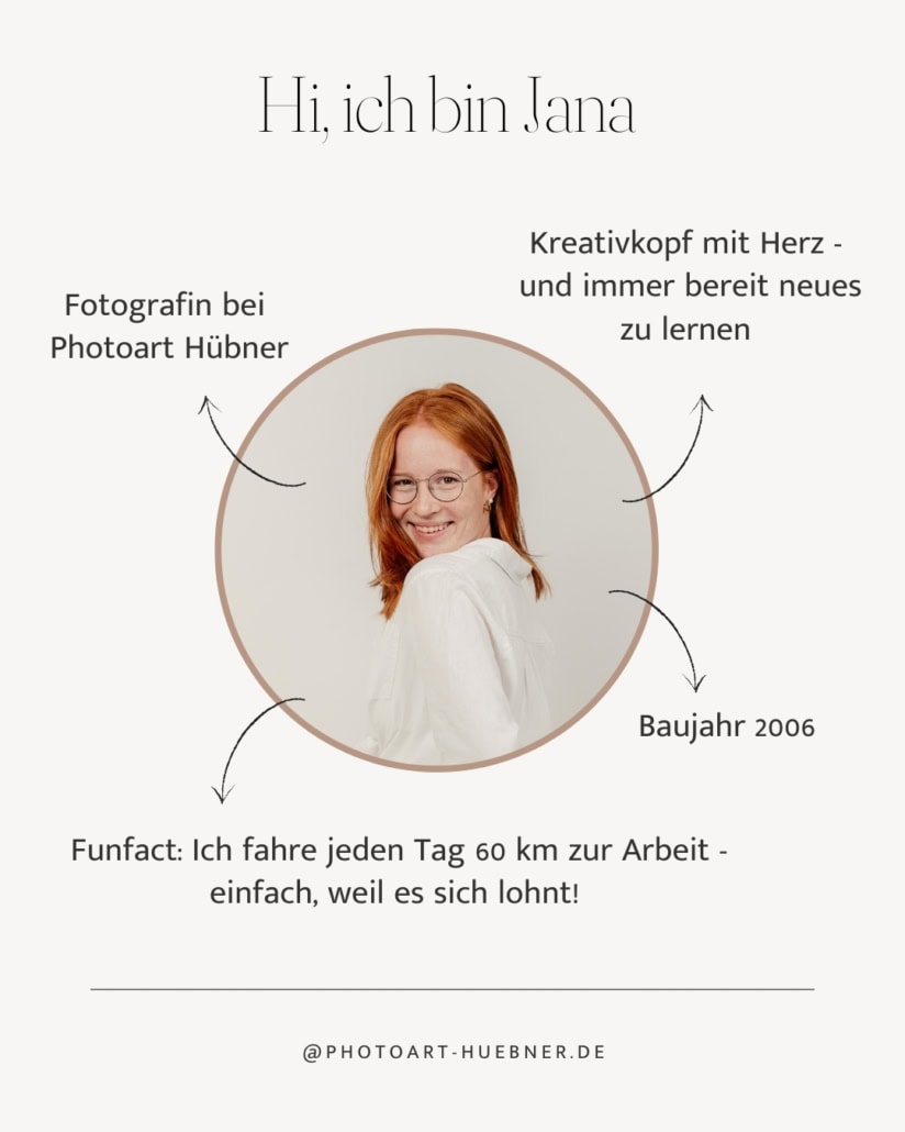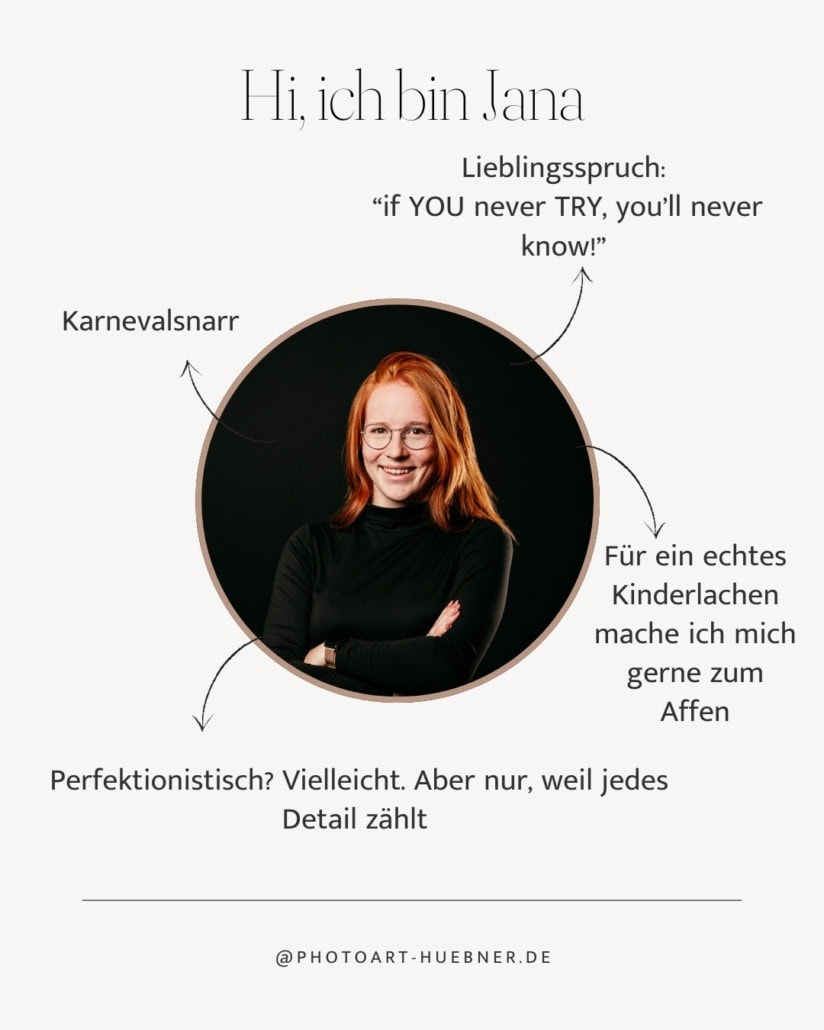 Hallo, ich bin Jana und komme aus Nettetal und mit ganzem Herzen Fotografin. Ich bin ein kreativer Kopf, neugierig und immer mit Freude bei der Sache. Für mich ist die Kamera nicht nur ein Werkzeug, sondern eine Möglichkeit, Menschen, Emotionen und Momente auf eine ganz eigene Weise festzuhalten. Ich liebe es, Neues zu lernen, auszuprobieren und dabei meine eigene Handschrift weiterzuentwickeln.