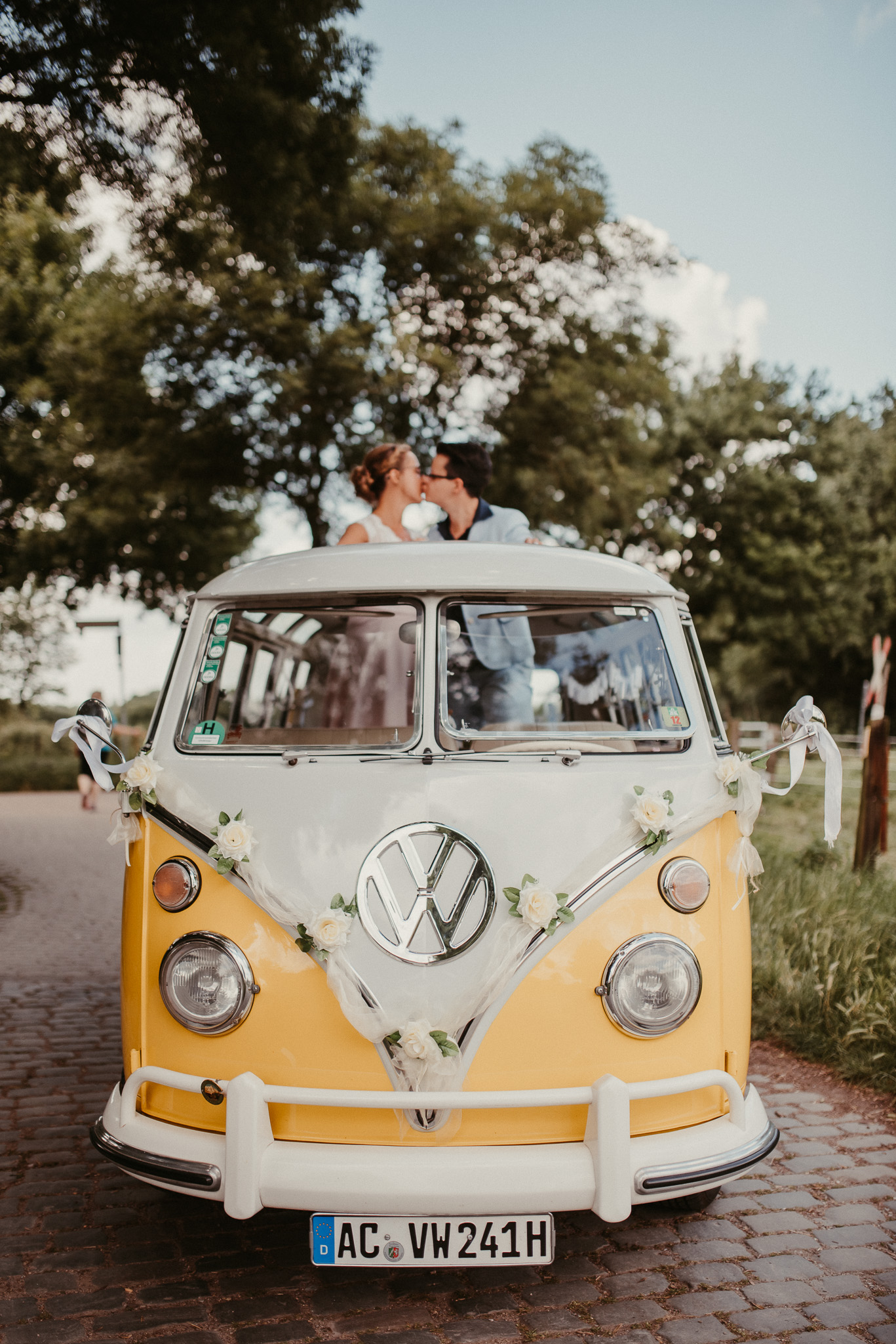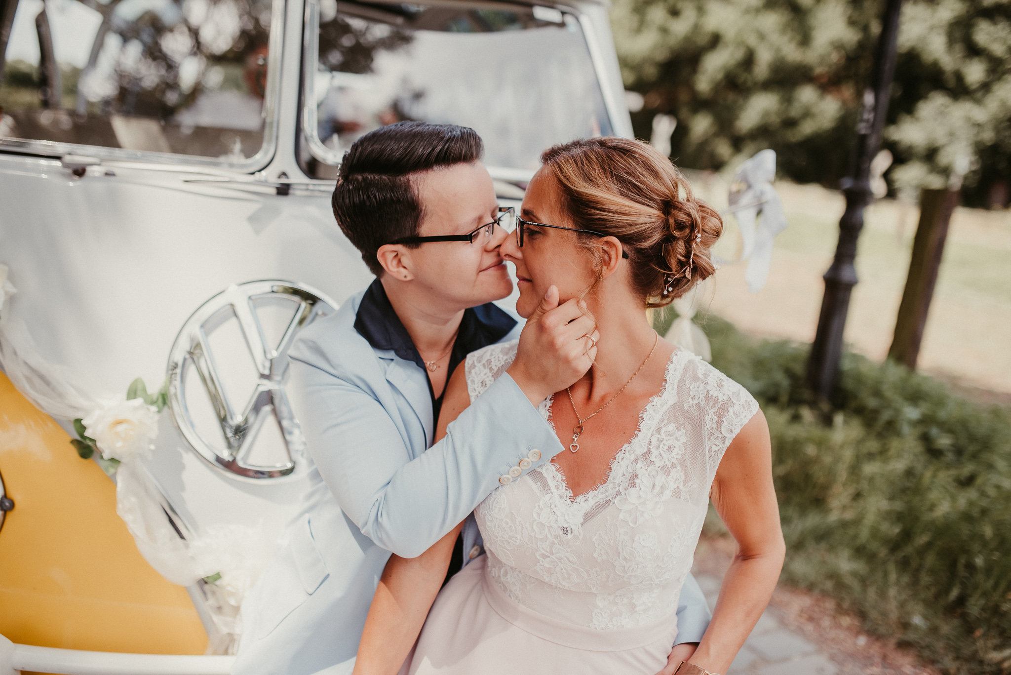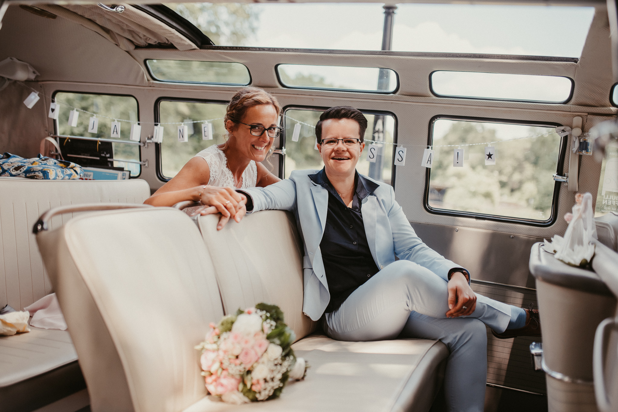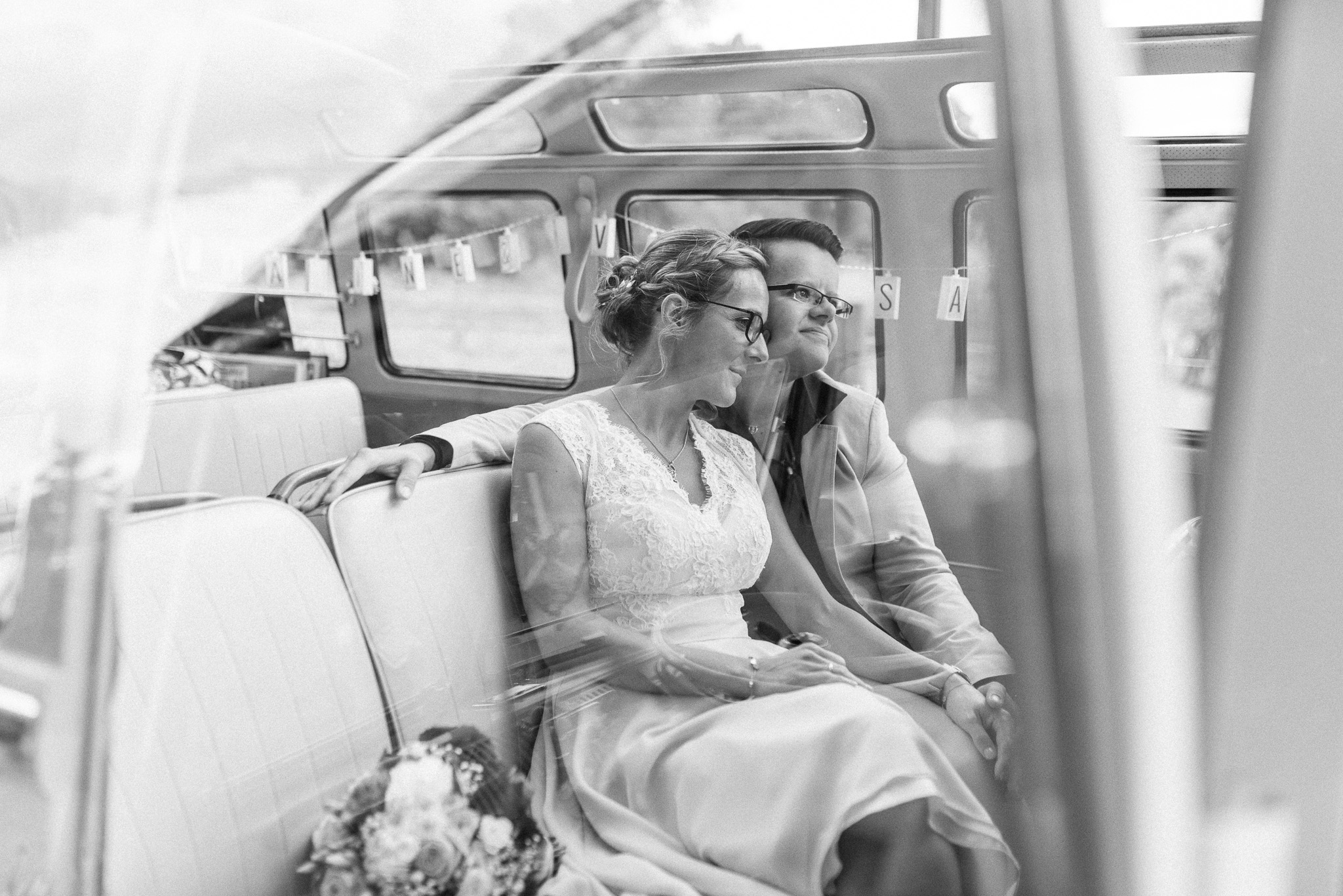 Wenn ich an die Hochzeit von Janine und Vanessa denke, muss ich direkt schmunzeln. Die Fahrt mit diesem abgefahrenen Bulli war schon Klasse. Vor allem, weil es ein Cabrio Bulli war. Cabrio Bulli, schönes Wetter und ein großartiges Paar. Perfekt! Bei unserem Kennlerntreffen hatte ich die ganze Zeit im Kopf: Woher kenne ich die „Braut“? Ich bin höchst vergesslich, aber Gesichter kann ich mir merken. Es stellte sich heraus, dass wir uns aus unserer alten Heimat kennen – aus Recklinghausen Hochlarmark. Deshalb waren wir direkt auf einer Wellenlänge (Ruhrpott halt). ? So klein ist die Welt, dass wir uns in meinem Ratinger Fotoatelier wieder getroffen haben.