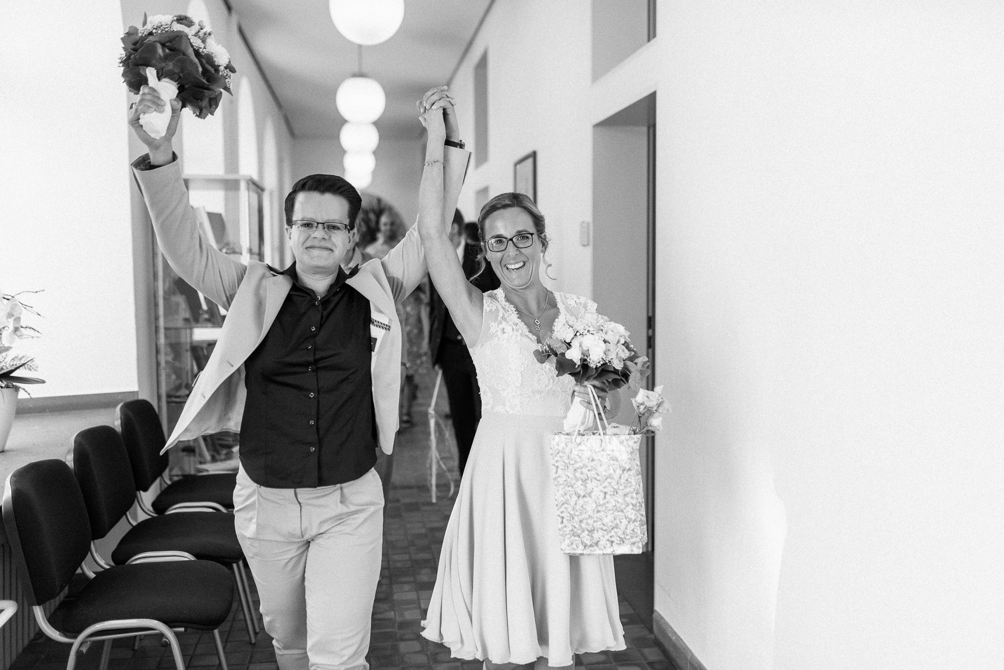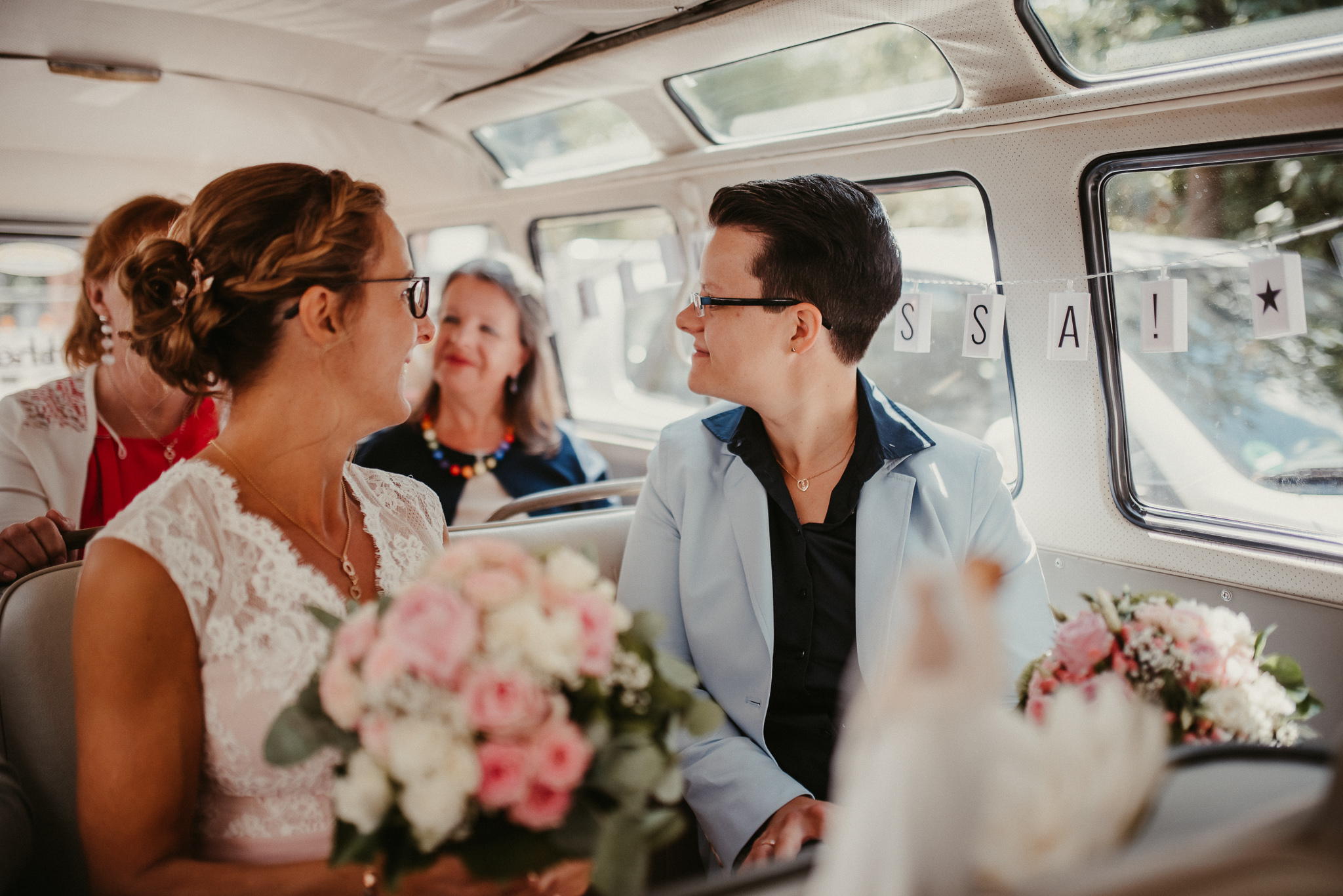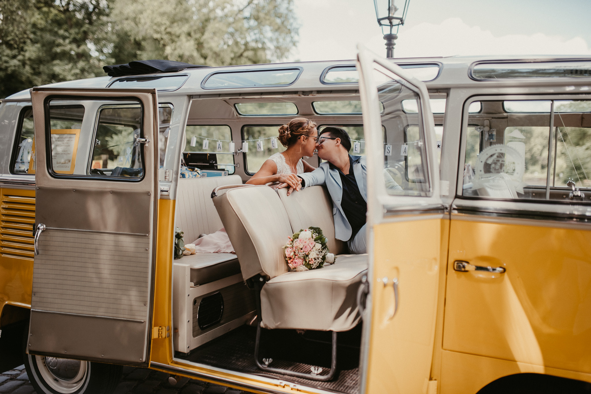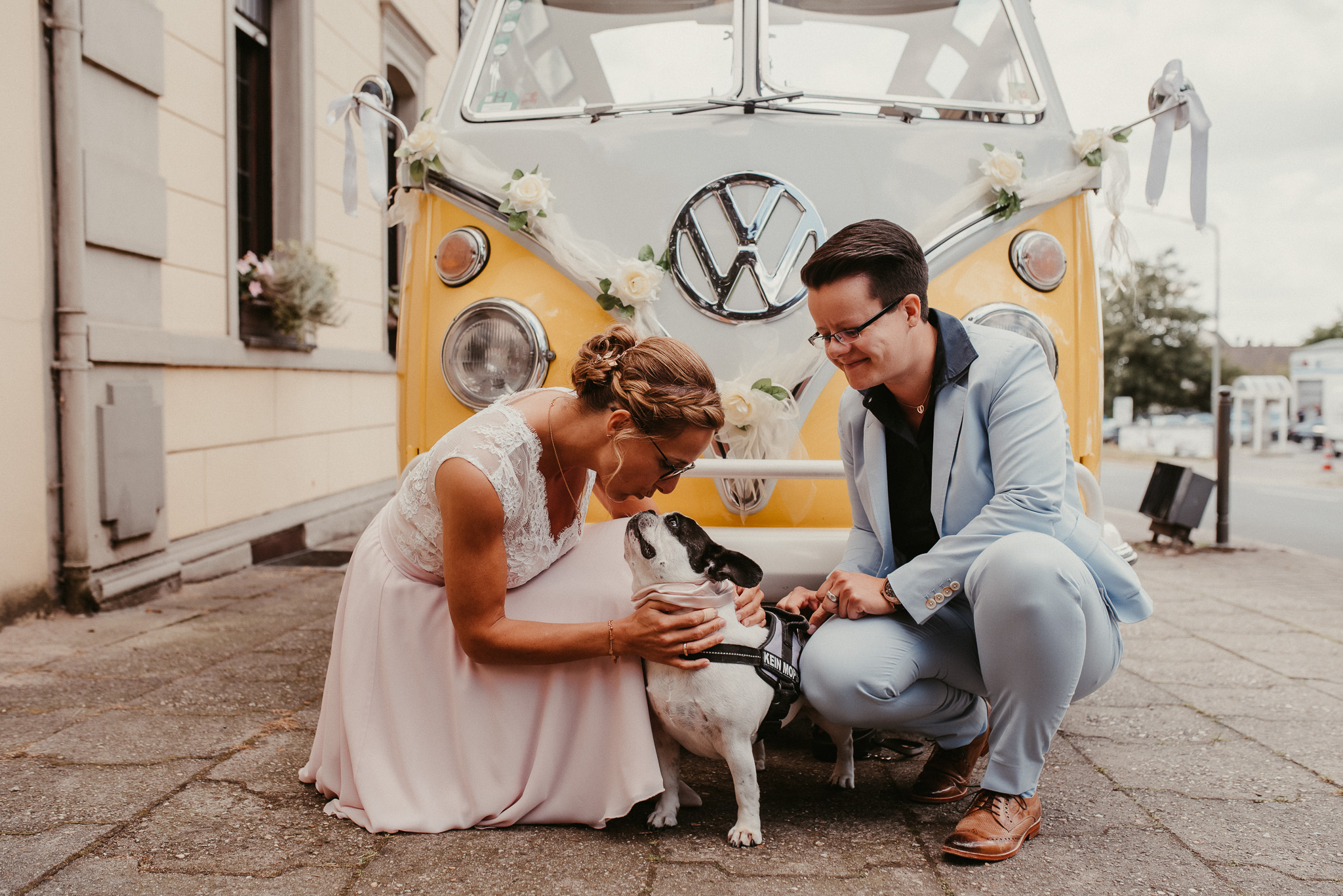 Wenn ich an die Hochzeit von Janine und Vanessa denke, muss ich direkt schmunzeln. Die Fahrt mit diesem abgefahrenen Bulli war schon Klasse. Vor allem, weil es ein Cabrio Bulli war. Cabrio Bulli, schönes Wetter und ein großartiges Paar. Perfekt! Bei unserem Kennlerntreffen hatte ich die ganze Zeit im Kopf: Woher kenne ich die „Braut“? Ich bin höchst vergesslich, aber Gesichter kann ich mir merken. Es stellte sich heraus, dass wir uns aus unserer alten Heimat kennen – aus Recklinghausen Hochlarmark. Deshalb waren wir direkt auf einer Wellenlänge (Ruhrpott halt). ? So klein ist die Welt, dass wir uns in meinem Ratinger Fotoatelier wieder getroffen haben.