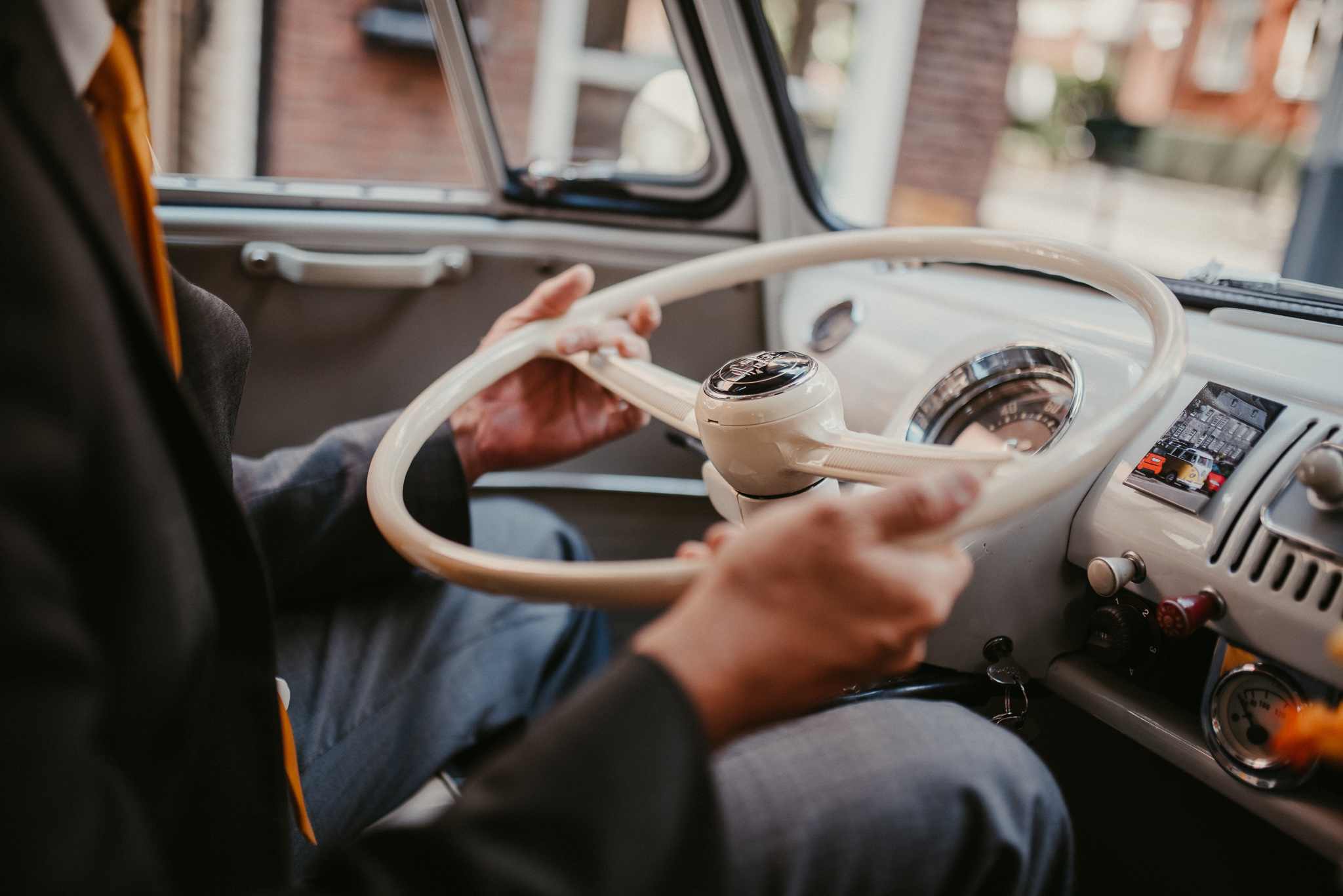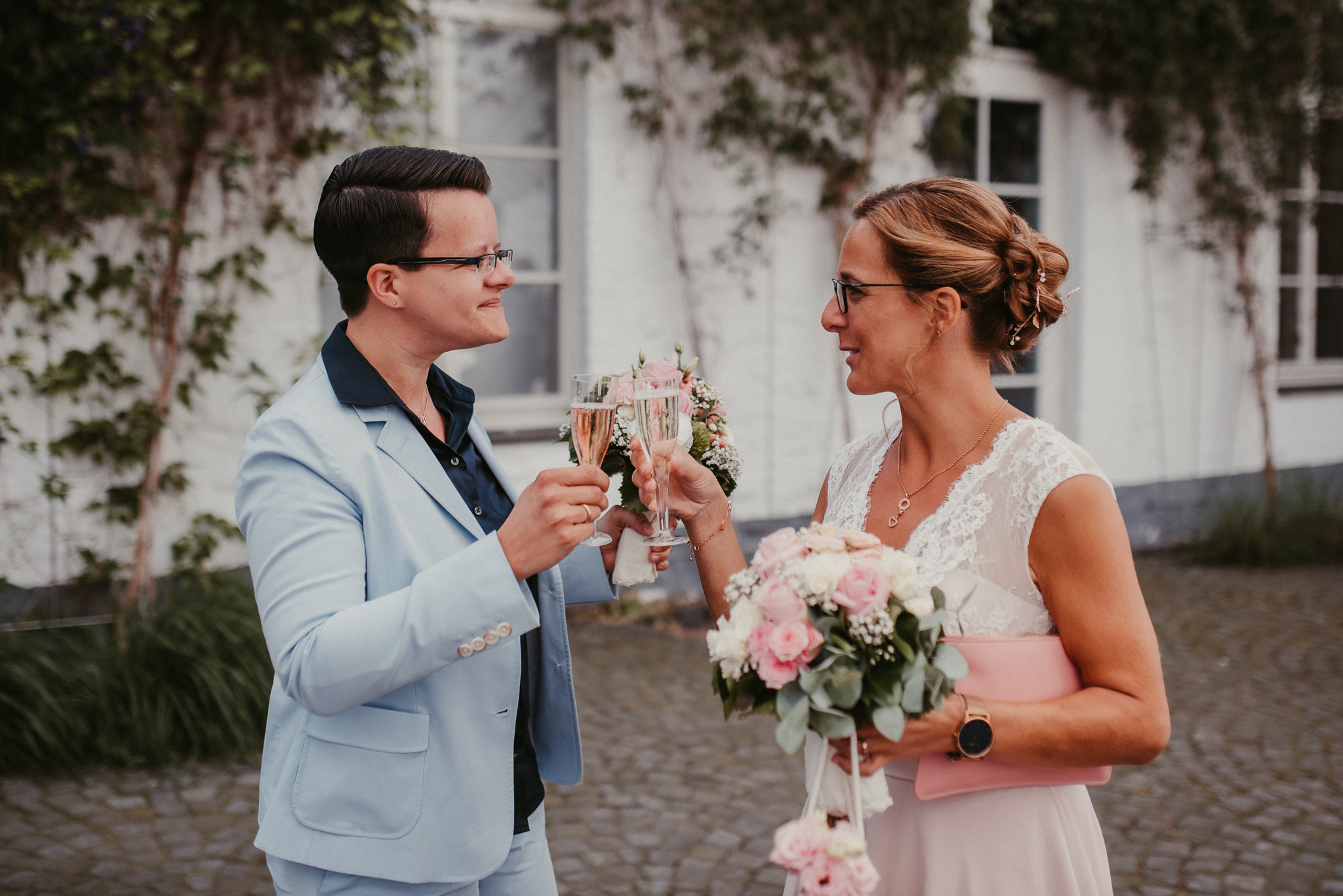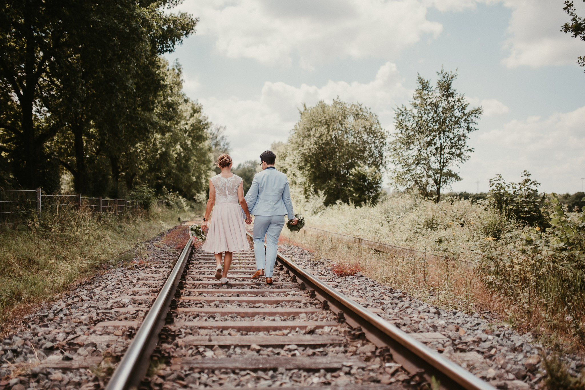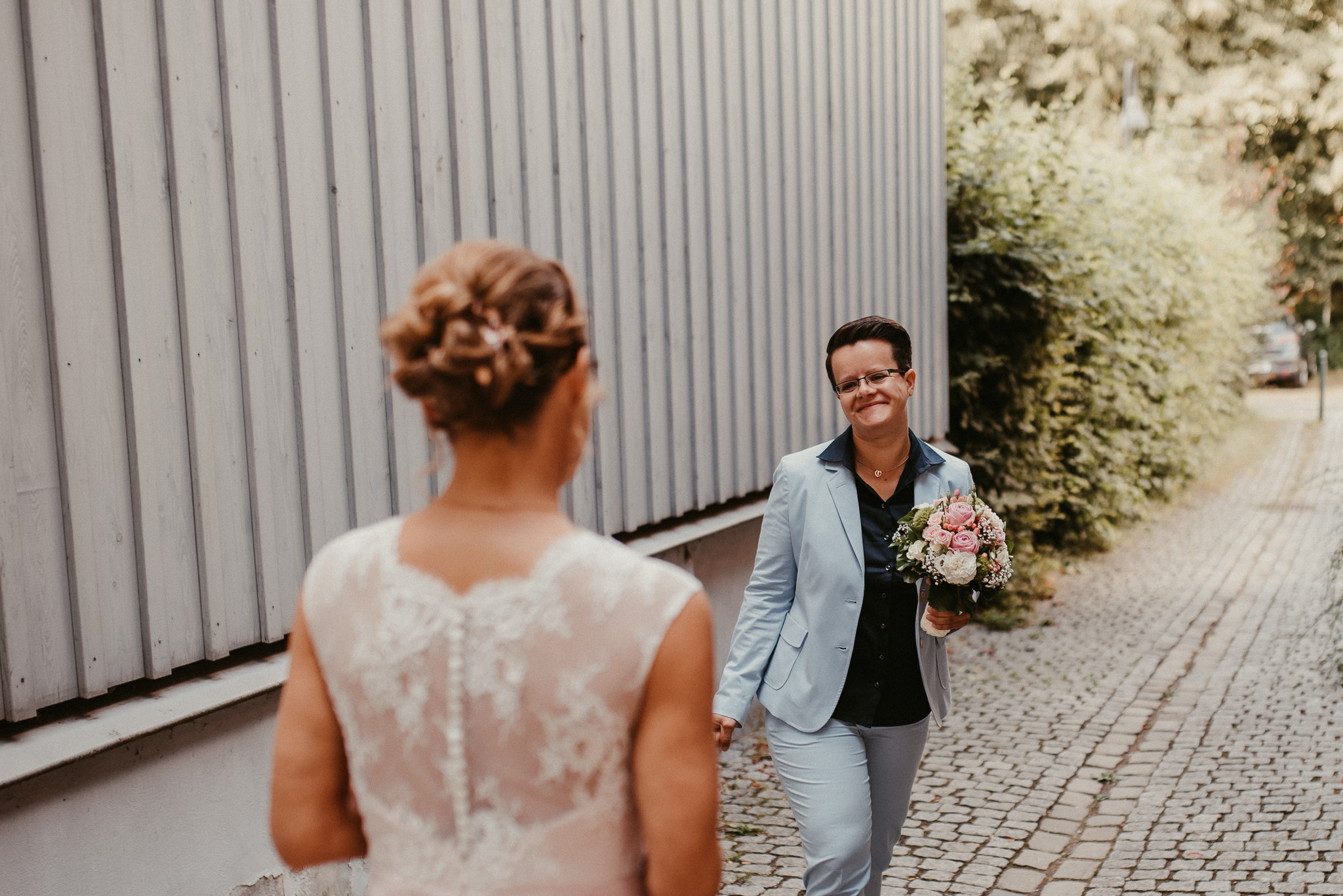 Wenn ich an die Hochzeit von Janine und Vanessa denke, muss ich direkt schmunzeln. Die Fahrt mit diesem abgefahrenen Bulli war schon Klasse. Vor allem, weil es ein Cabrio Bulli war. Cabrio Bulli, schönes Wetter und ein großartiges Paar. Perfekt! Bei unserem Kennlerntreffen hatte ich die ganze Zeit im Kopf: Woher kenne ich die „Braut“? Ich bin höchst vergesslich, aber Gesichter kann ich mir merken. Es stellte sich heraus, dass wir uns aus unserer alten Heimat kennen – aus Recklinghausen Hochlarmark. Deshalb waren wir direkt auf einer Wellenlänge (Ruhrpott halt). ? So klein ist die Welt, dass wir uns in meinem Ratinger Fotoatelier wieder getroffen haben.