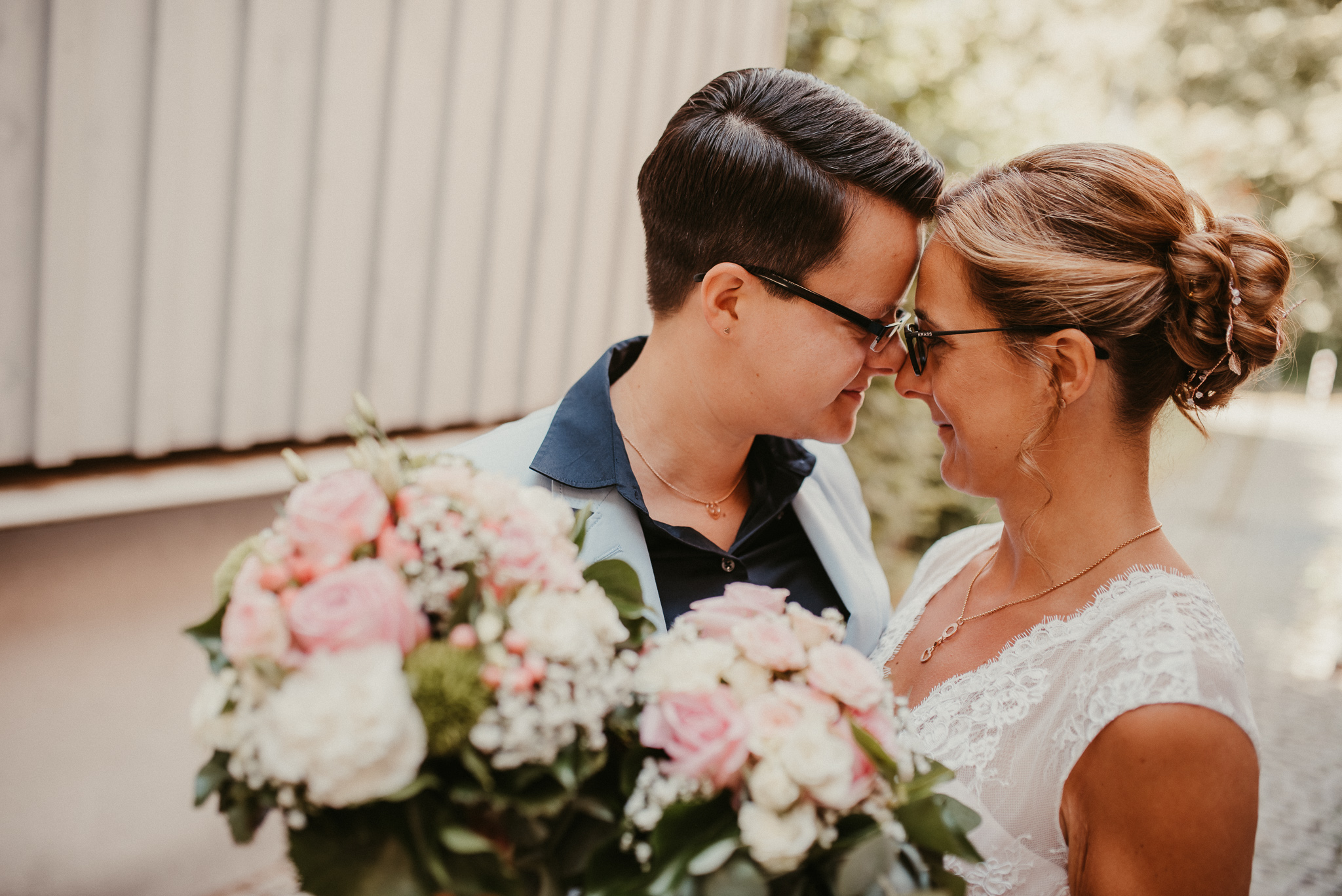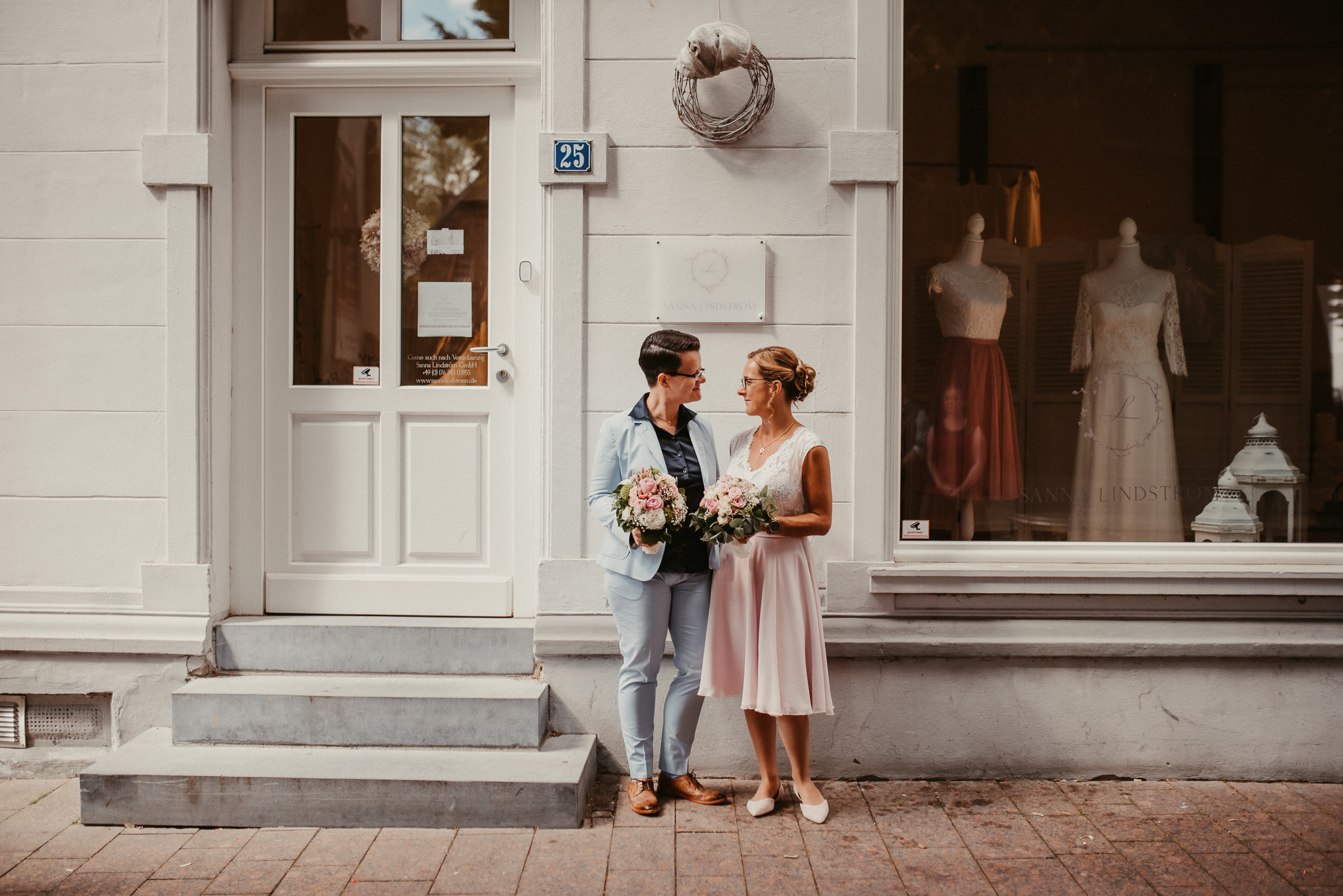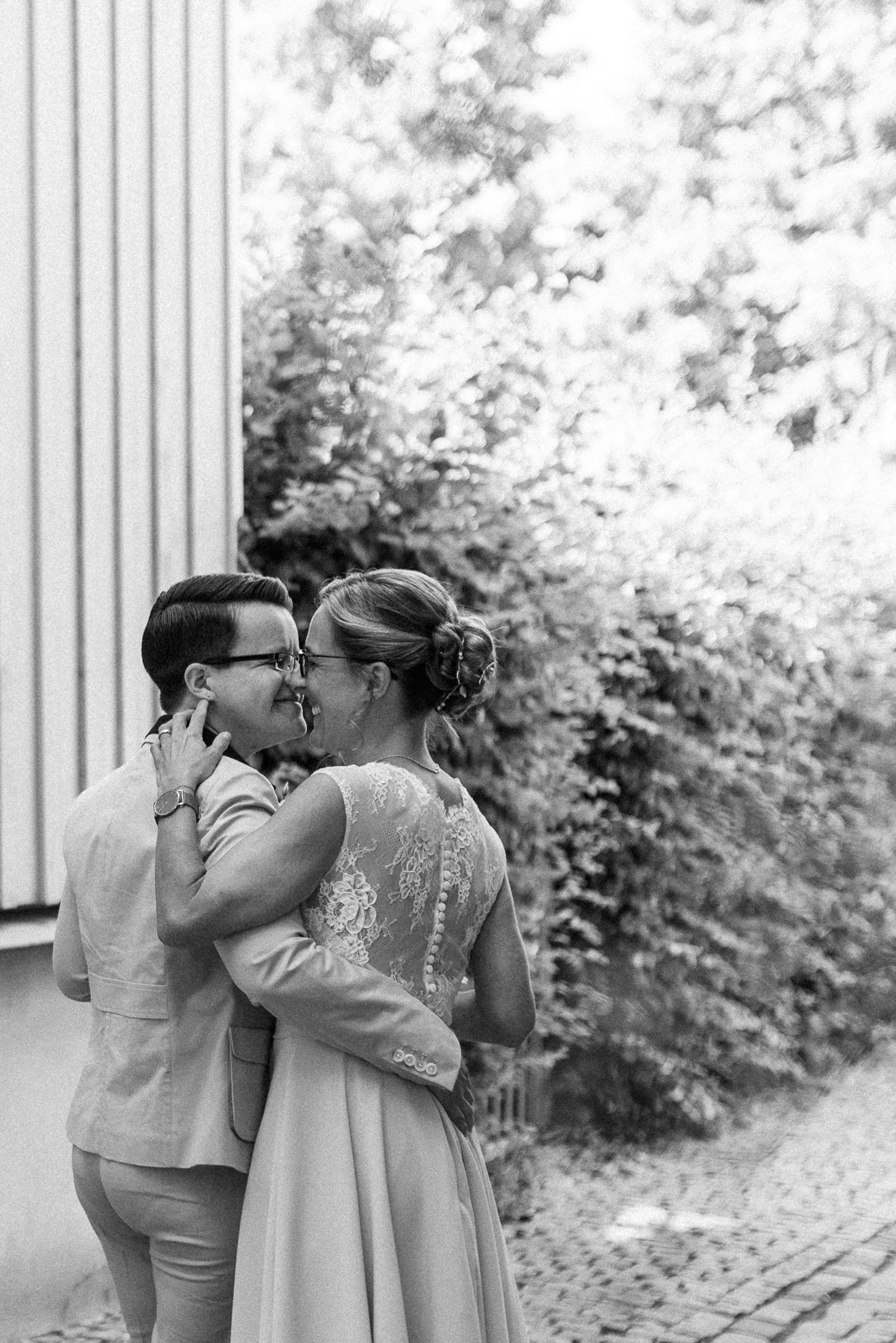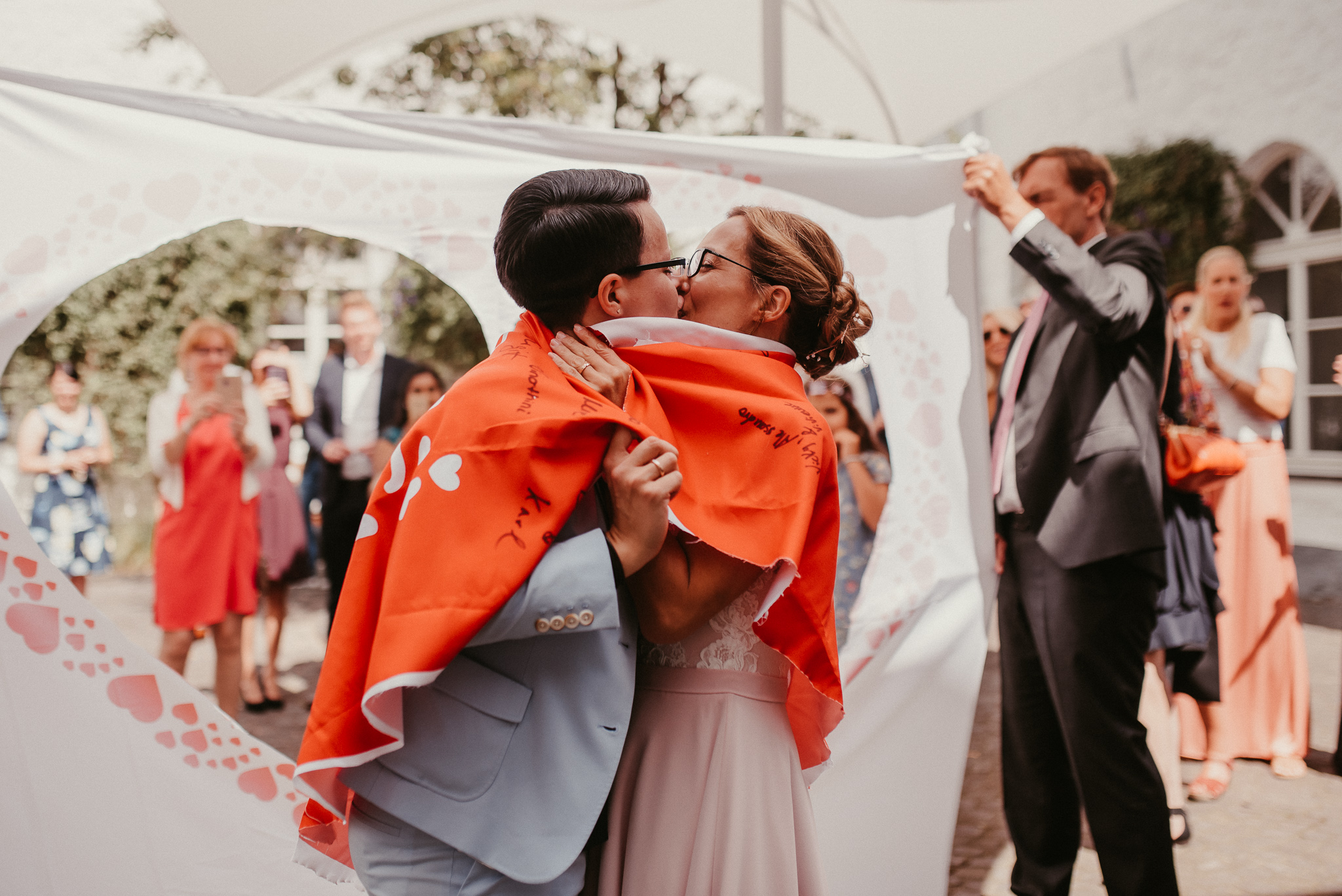 Wenn ich an die Hochzeit von Janine und Vanessa denke, muss ich direkt schmunzeln. Die Fahrt mit diesem abgefahrenen Bulli war schon Klasse. Vor allem, weil es ein Cabrio Bulli war. Cabrio Bulli, schönes Wetter und ein großartiges Paar. Perfekt! Bei unserem Kennlerntreffen hatte ich die ganze Zeit im Kopf: Woher kenne ich die „Braut“? Ich bin höchst vergesslich, aber Gesichter kann ich mir merken. Es stellte sich heraus, dass wir uns aus unserer alten Heimat kennen – aus Recklinghausen Hochlarmark. Deshalb waren wir direkt auf einer Wellenlänge (Ruhrpott halt). ? So klein ist die Welt, dass wir uns in meinem Ratinger Fotoatelier wieder getroffen haben.