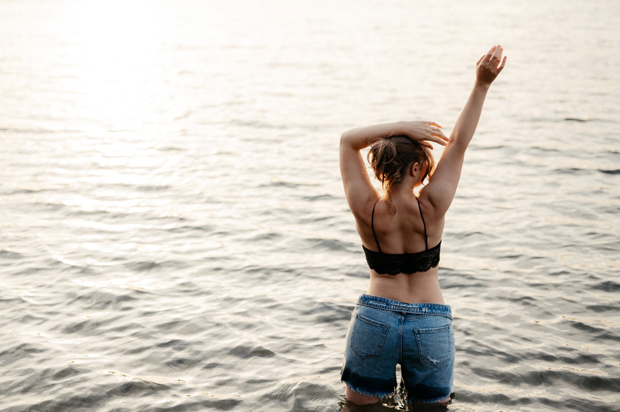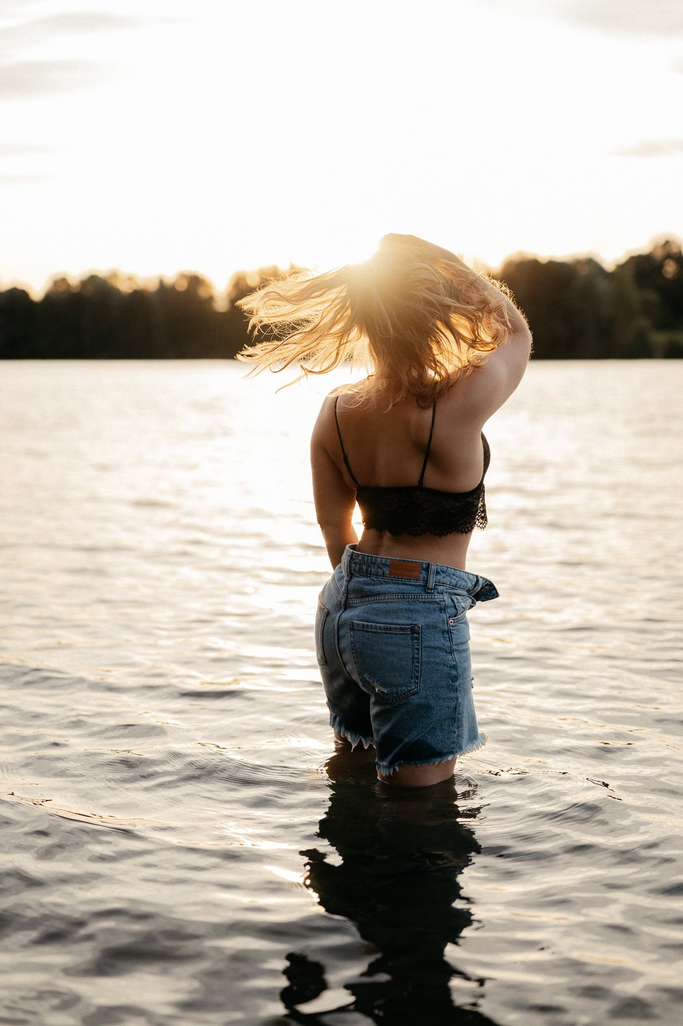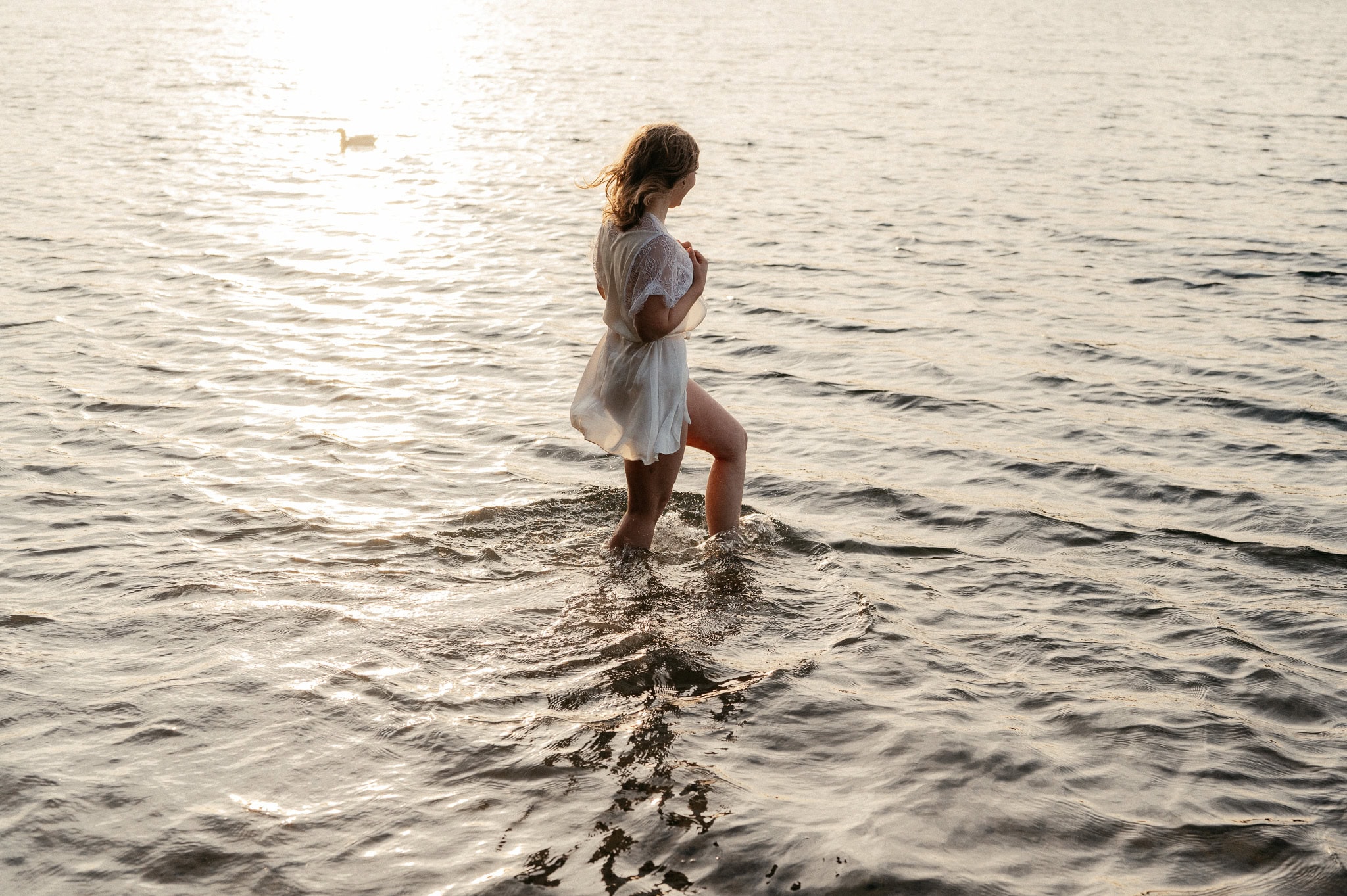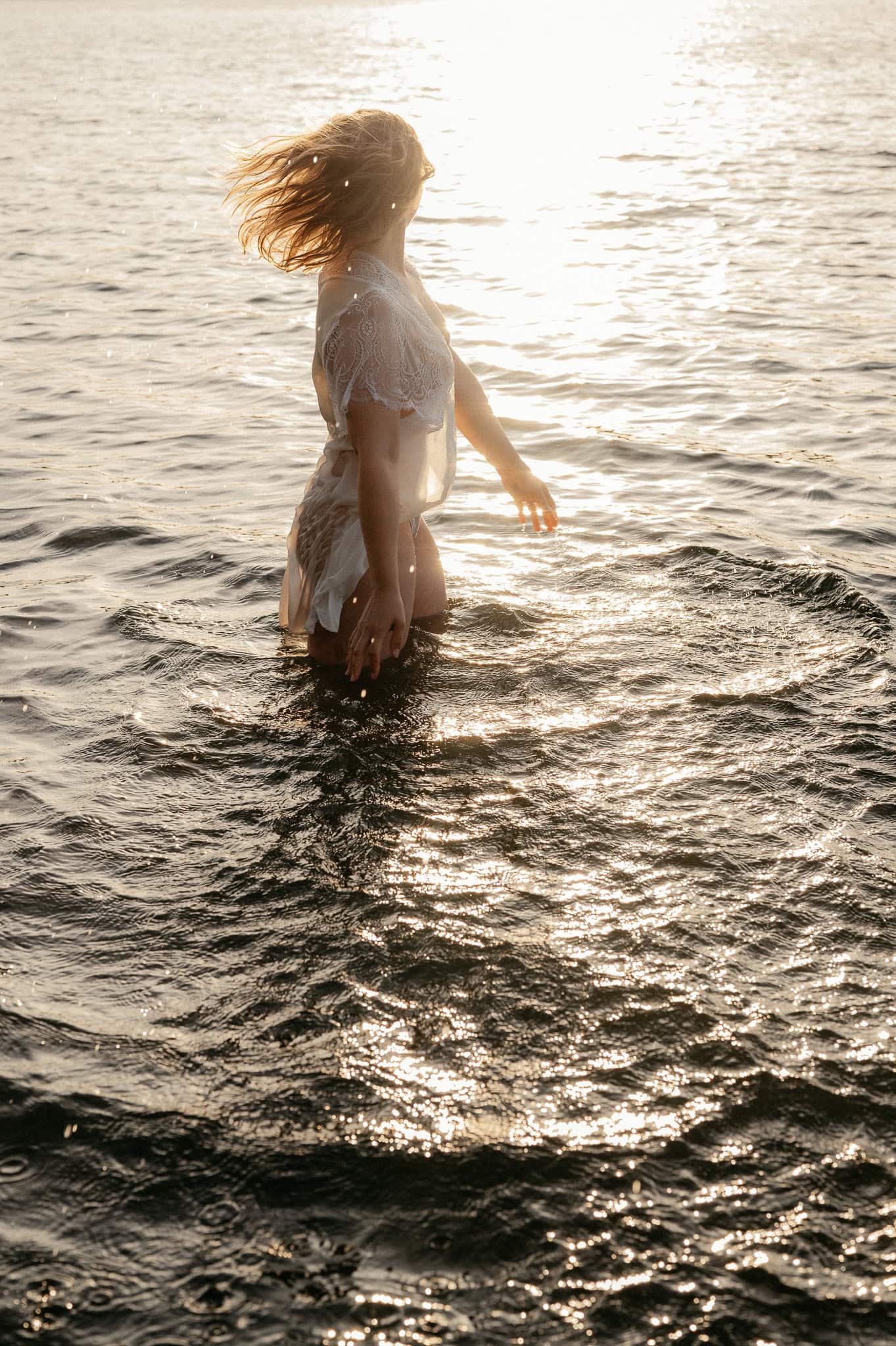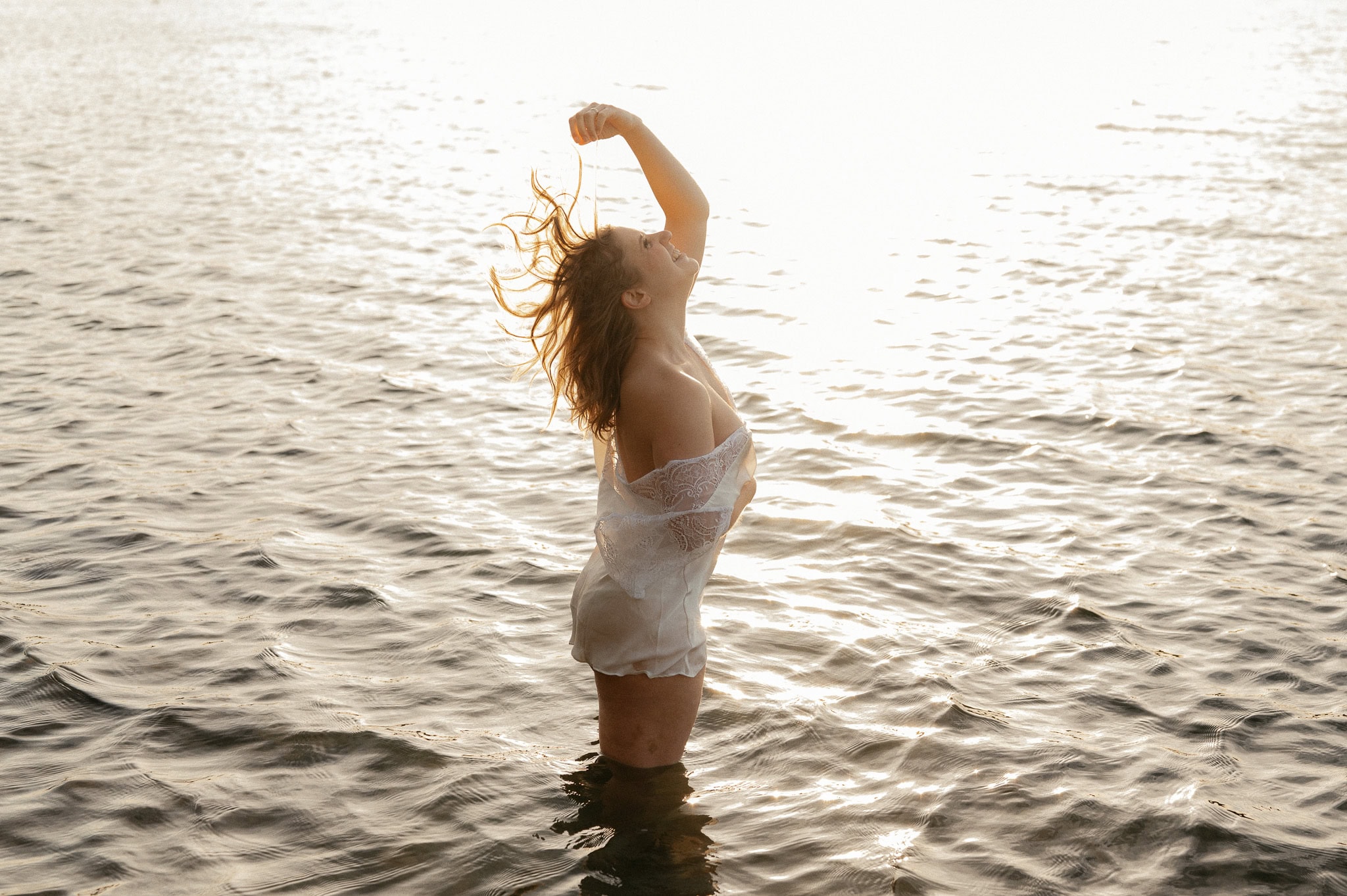 Du entscheidest, ob Du ganz ins Wasser spazierst oder nur mit den Beinen hereingehst. Am besten ist es, sich Schritt für Schritt heranzutasten. Genauso verhält es sich mit der Kleidung – Du entscheidest, was Du beim Boudoir-Wasser-Shooting tragen möchtest. Packe Dir in jedem Fall einen dicken Bademantel und ein warmes Getränk ein.