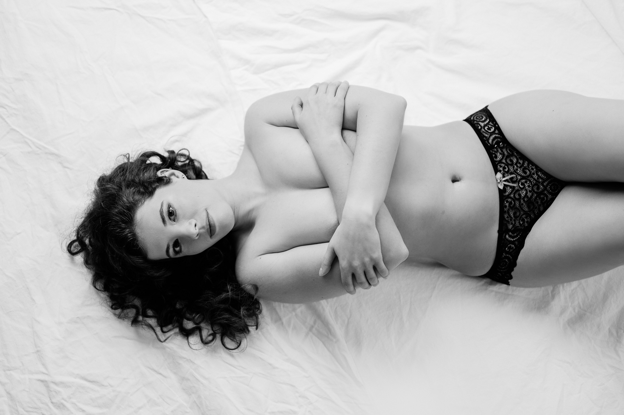 Zum Schluss schwarze Dessous mit Spitze. Klassisch, feminin und zeitlos. Sie funktionieren sowohl vor hellem Hintergrund als auch in unserem Bett-Foto-Set mit natürlichem Licht. Die Spitze bringt feine Details ins Bild und wirkt sinnlich, ohne zu viel zu wollen.