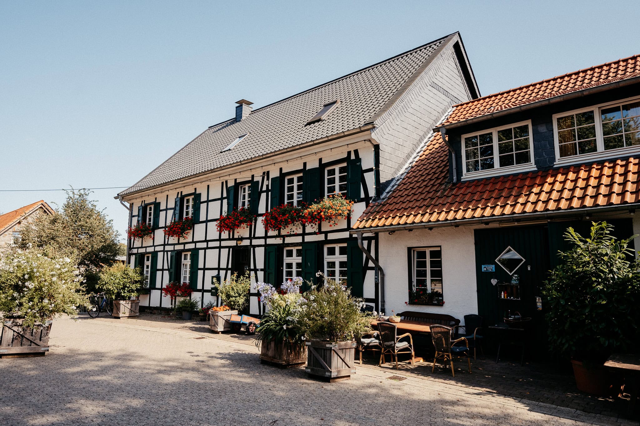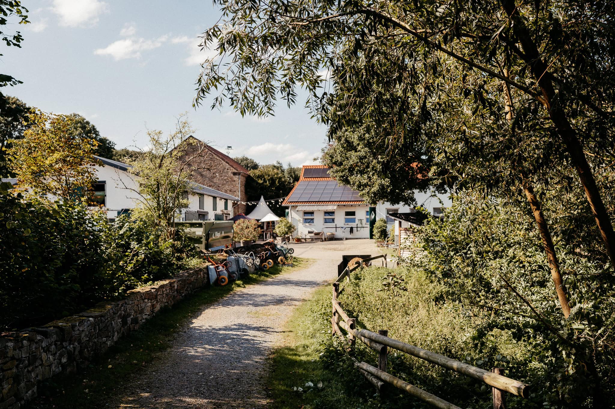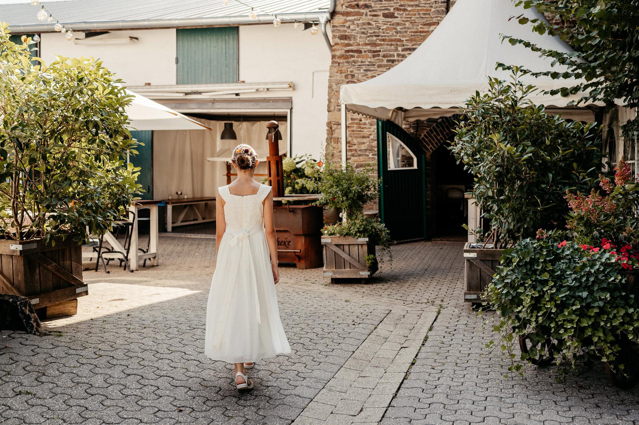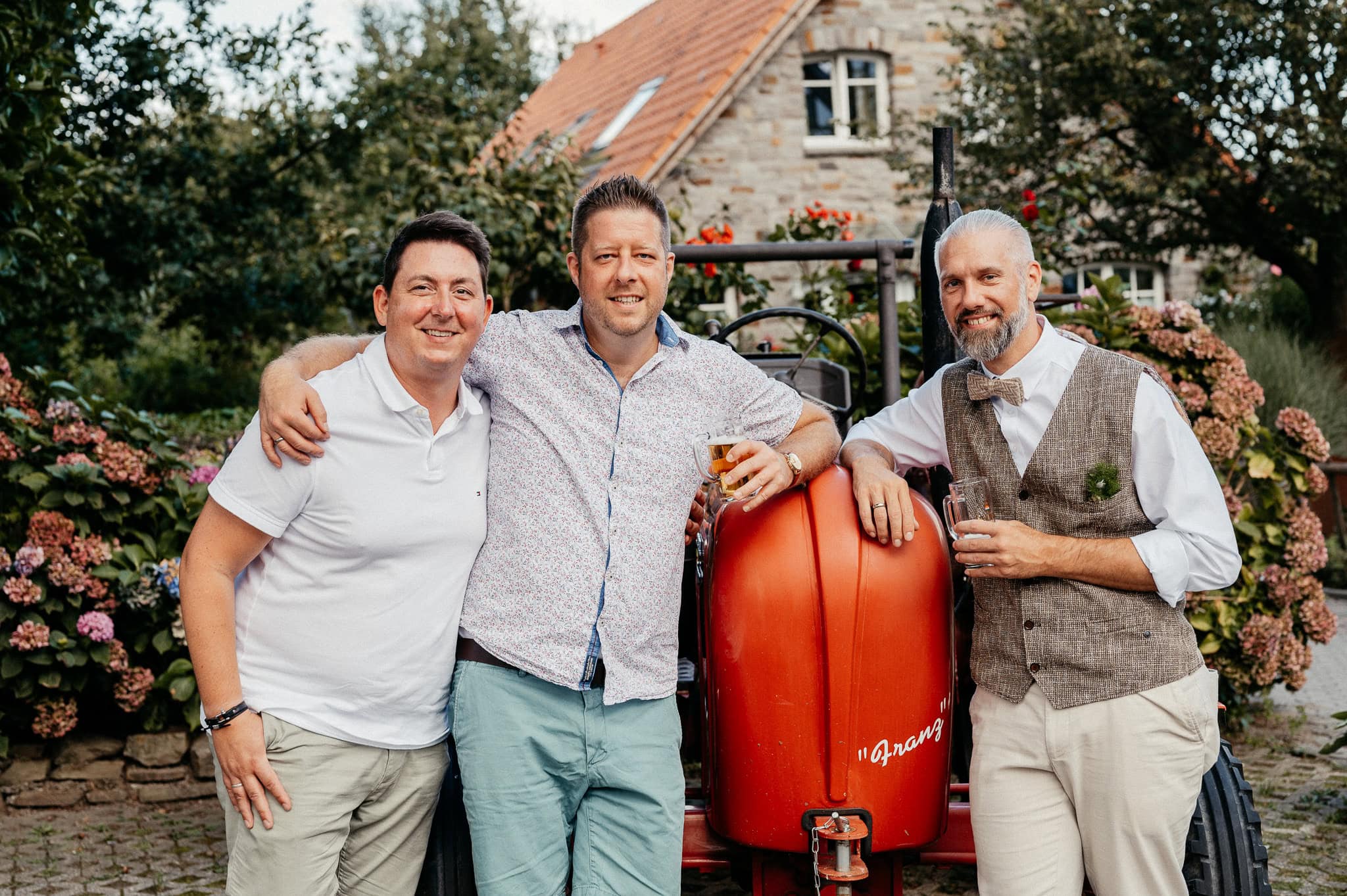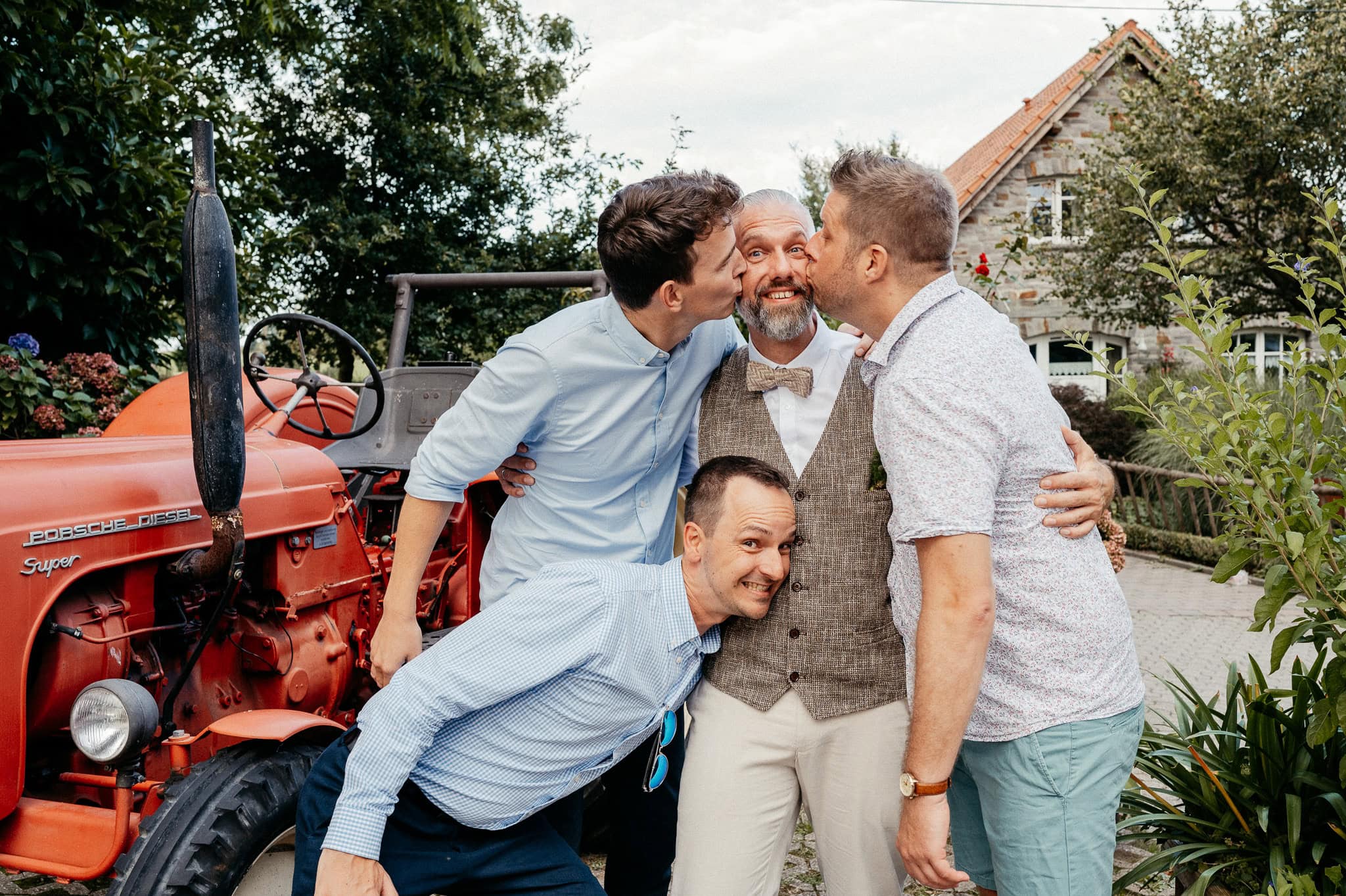 In den meisten Fällen bietet es sich vor Ort an die Hochzeitspaarfotos und Gruppenbilder zu machen. So ein schöner Hof, wie hier bietet oft viele verschieden Fotospots an, die für die Hochzeitsfotos super genutzt werden können. Vor Ort ergeben sich spontane Momente, die eingefangen werden können. Paarfotos entstehen oft natürlich im Ablauf des Tages. Kein Stress, keine langen Wege, kein Zeitdruck.