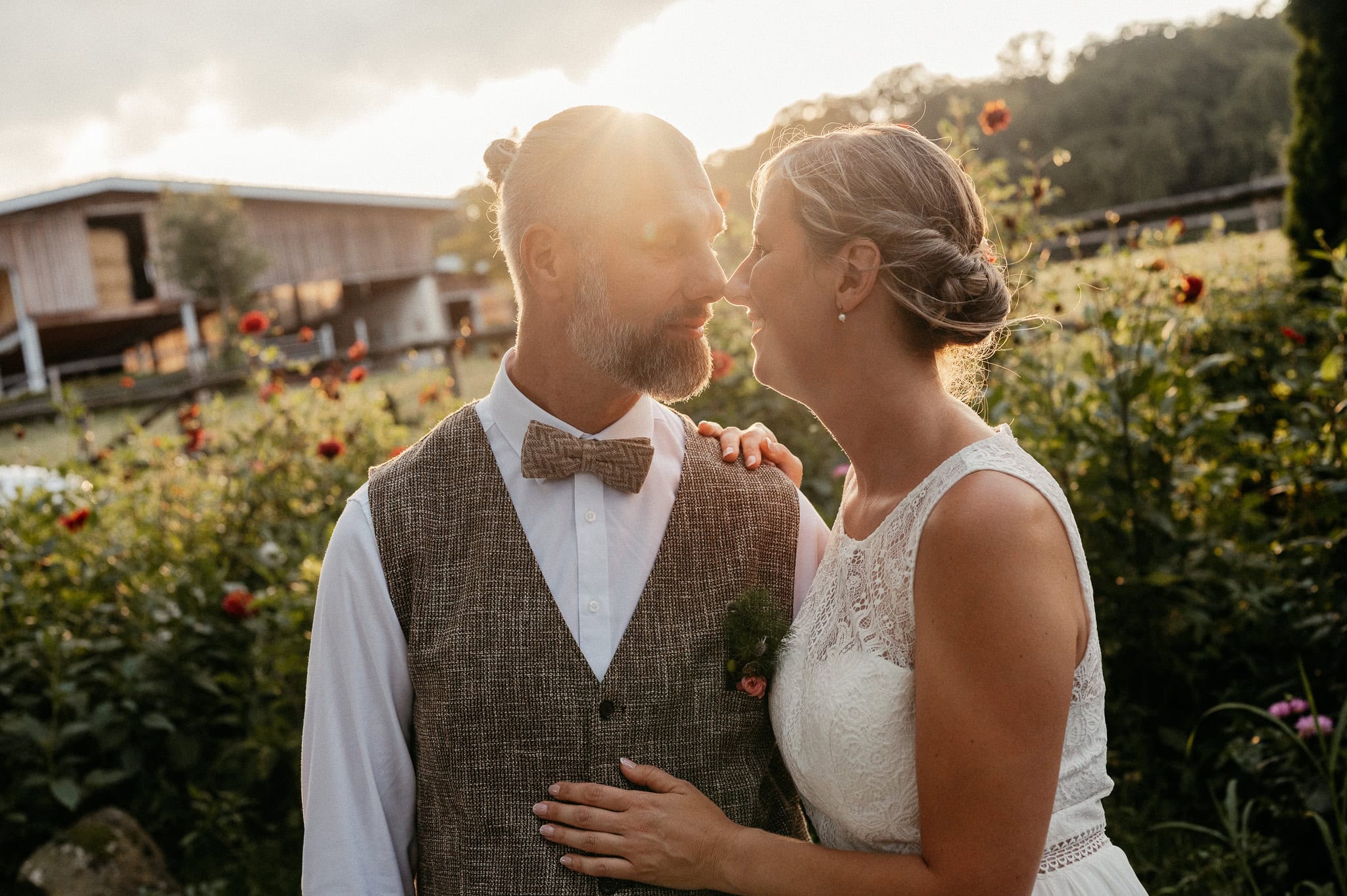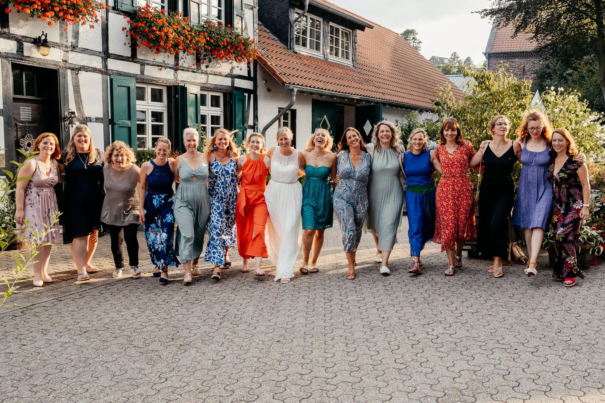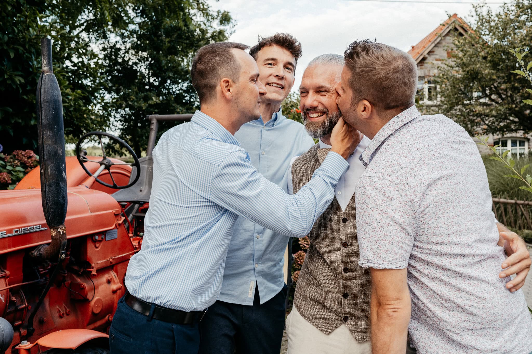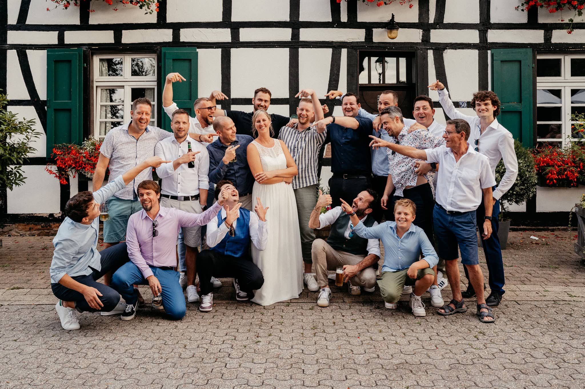 In den meisten Fällen bietet es sich vor Ort an die Hochzeitspaarfotos und Gruppenbilder zu machen. So ein schöner Hof, wie hier bietet oft viele verschieden Fotospots an, die für die Hochzeitsfotos super genutzt werden können. Vor Ort ergeben sich spontane Momente, die eingefangen werden können. Paarfotos entstehen oft natürlich im Ablauf des Tages. Kein Stress, keine langen Wege, kein Zeitdruck.