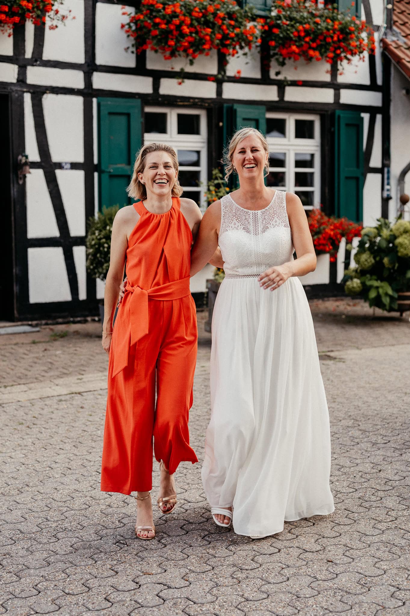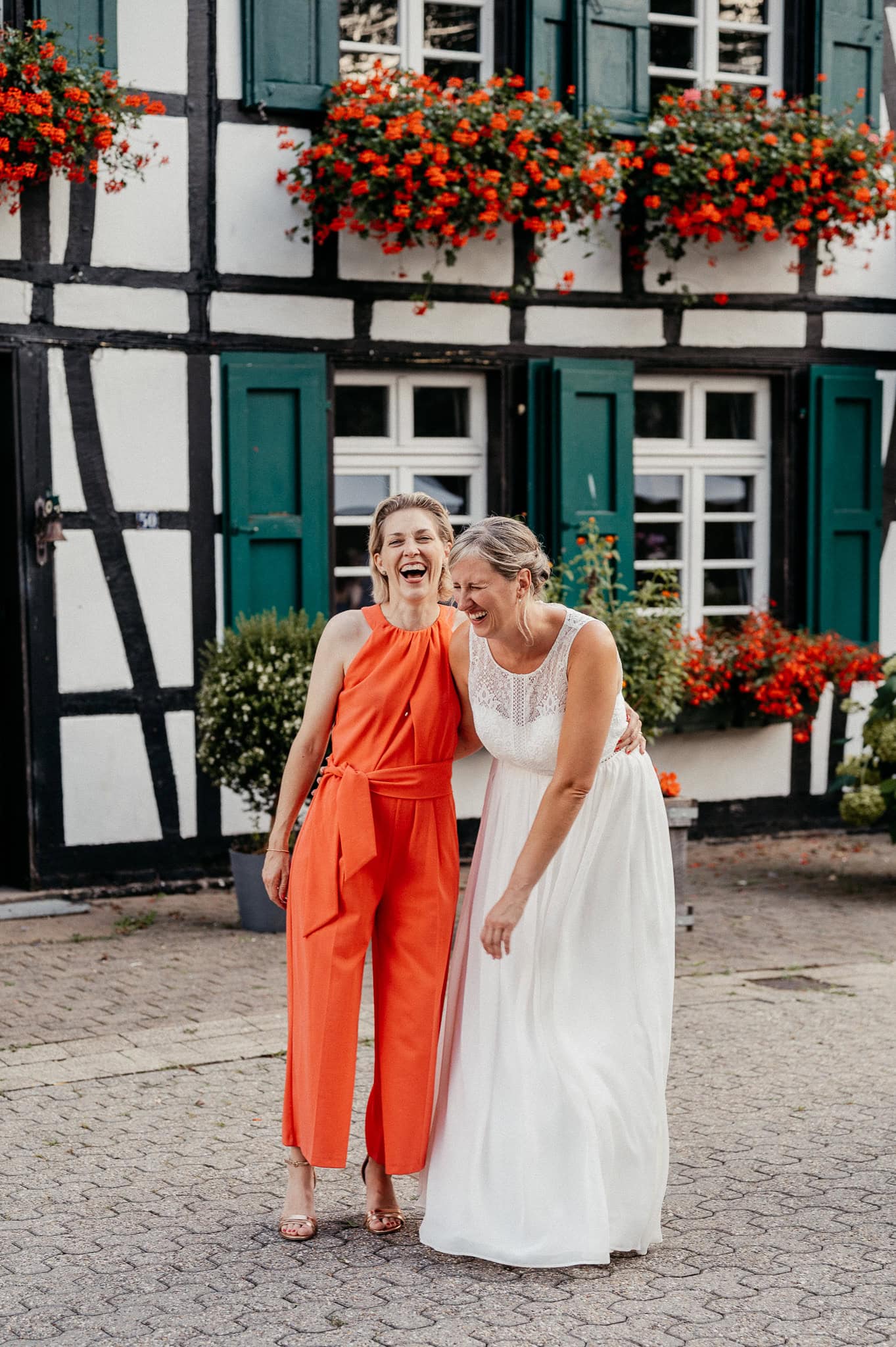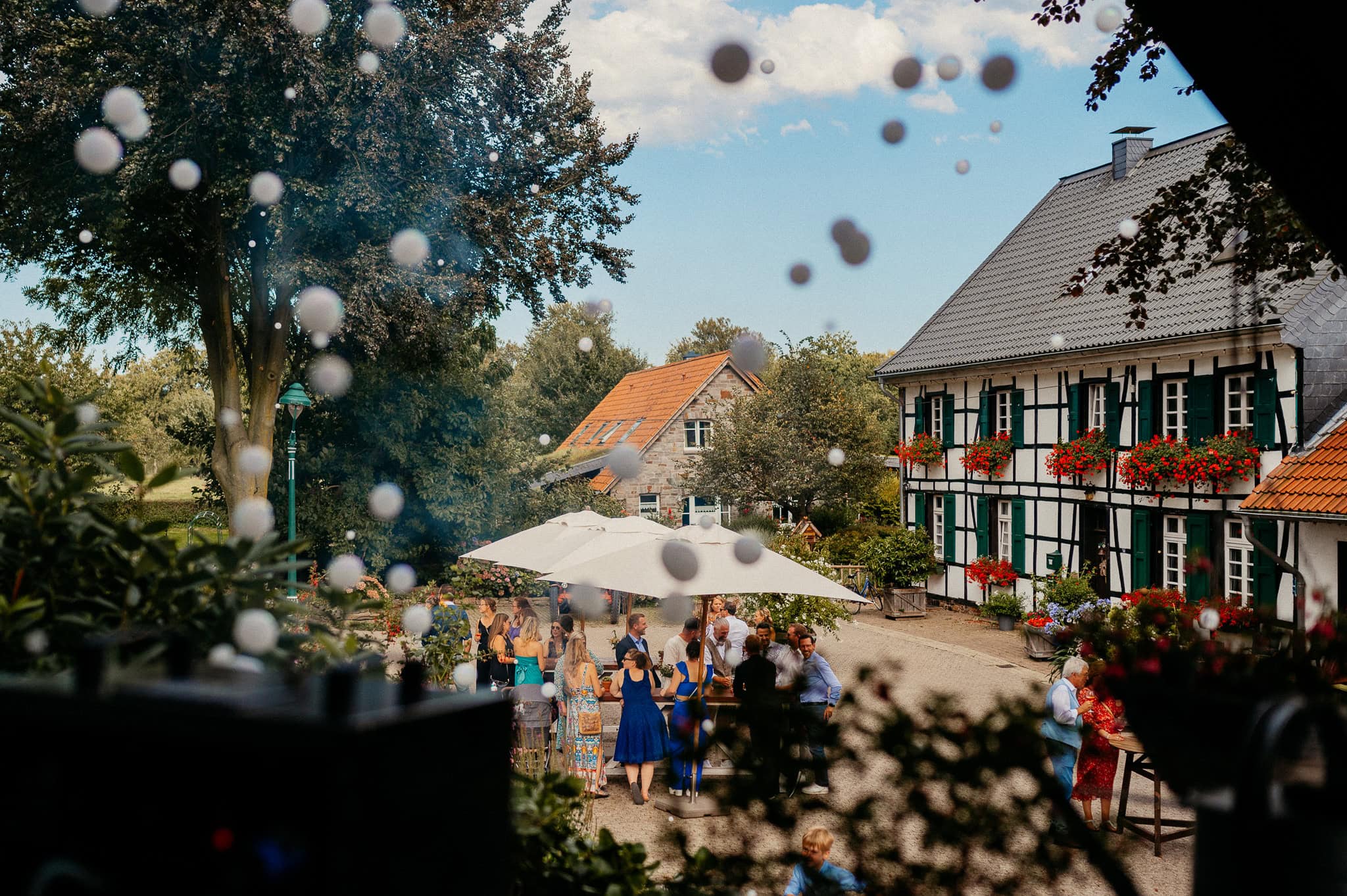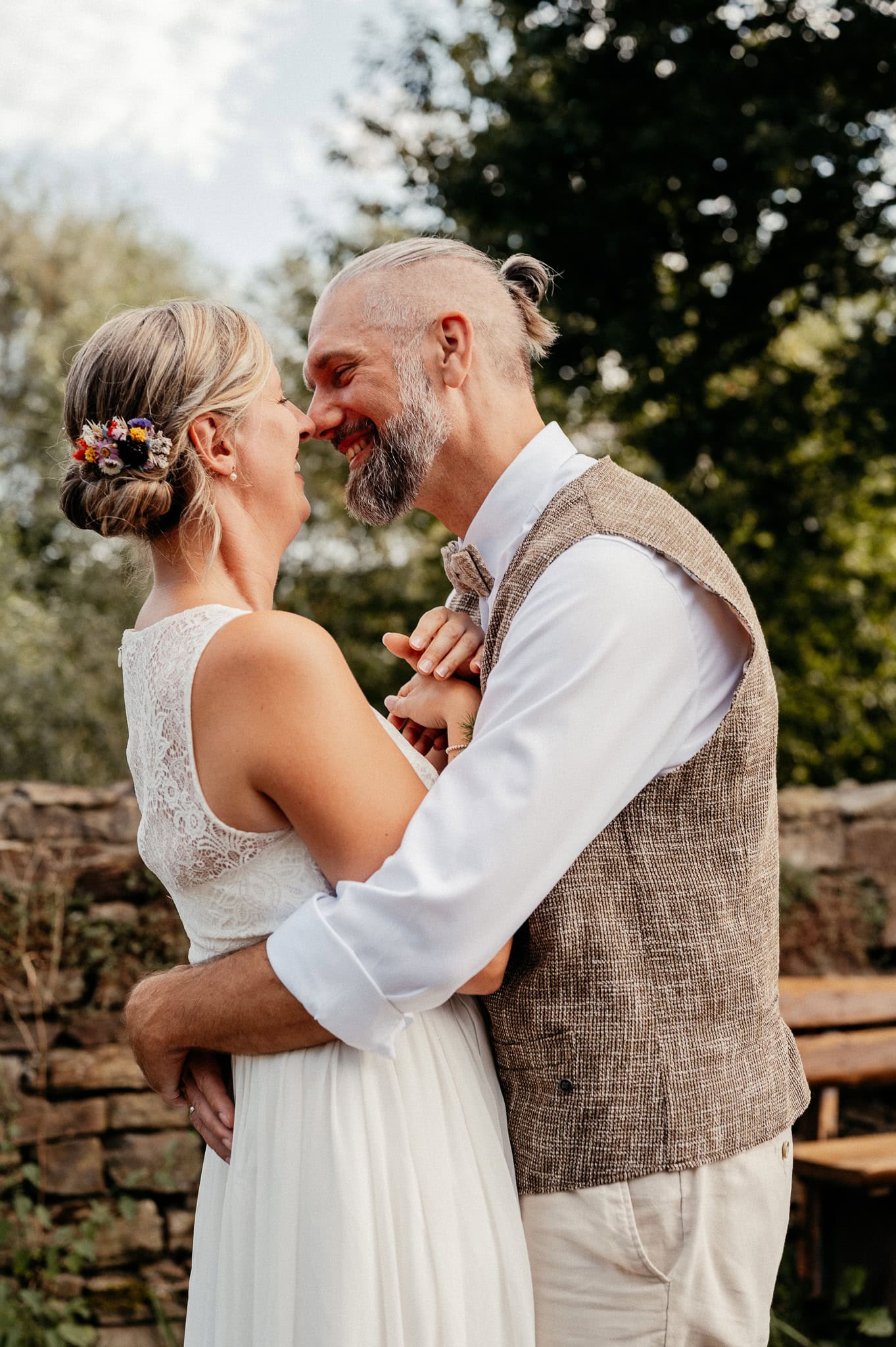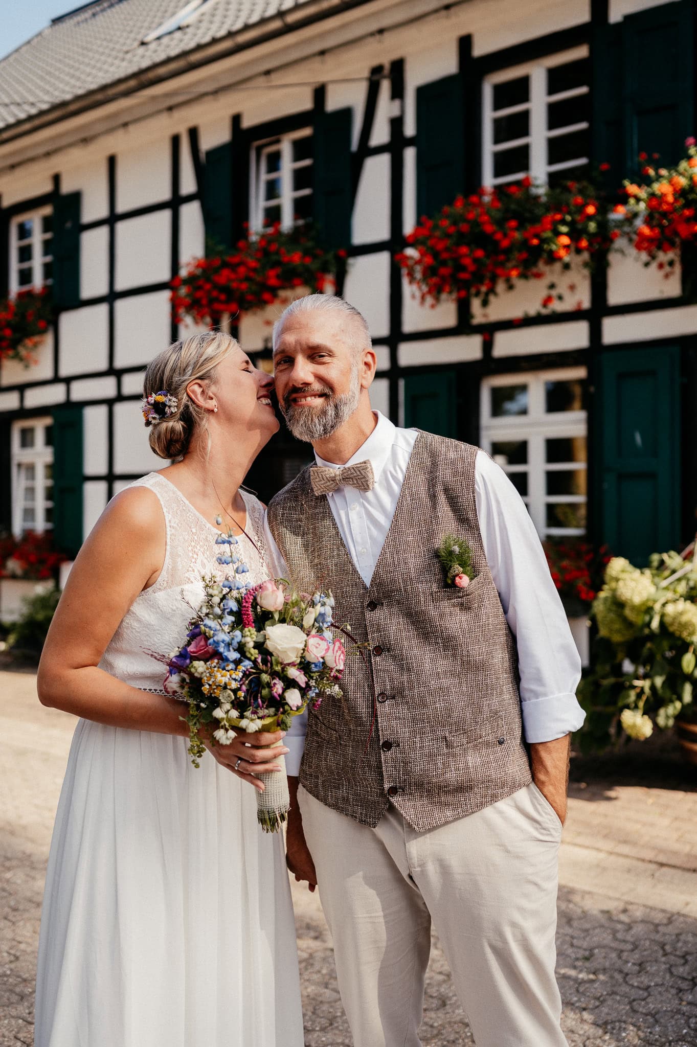 In den meisten Fällen bietet es sich vor Ort an die Hochzeitspaarfotos und Gruppenbilder zu machen. So ein schöner Hof, wie hier bietet oft viele verschieden Fotospots an, die für die Hochzeitsfotos super genutzt werden können. Vor Ort ergeben sich spontane Momente, die eingefangen werden können. Paarfotos entstehen oft natürlich im Ablauf des Tages. Kein Stress, keine langen Wege, kein Zeitdruck.