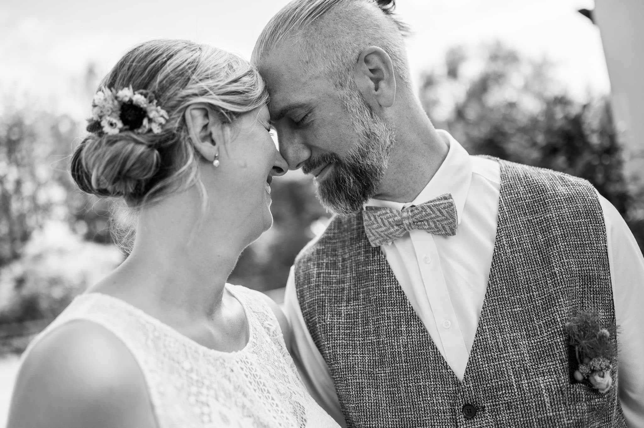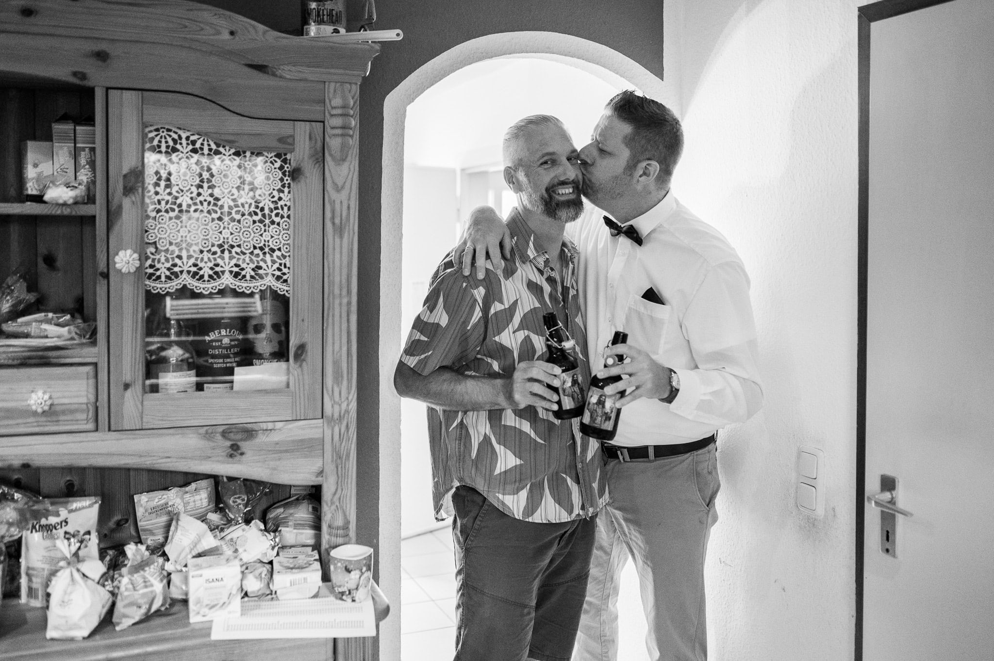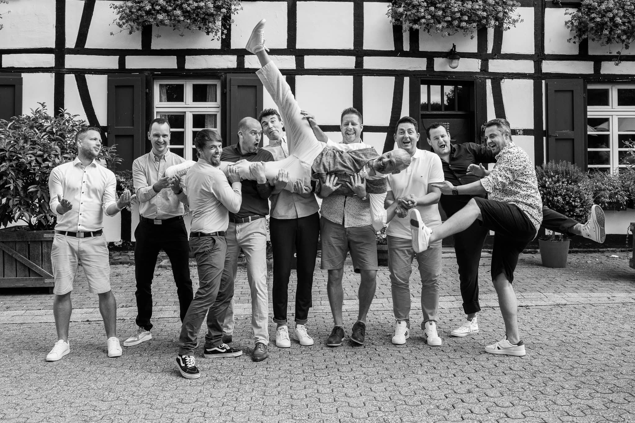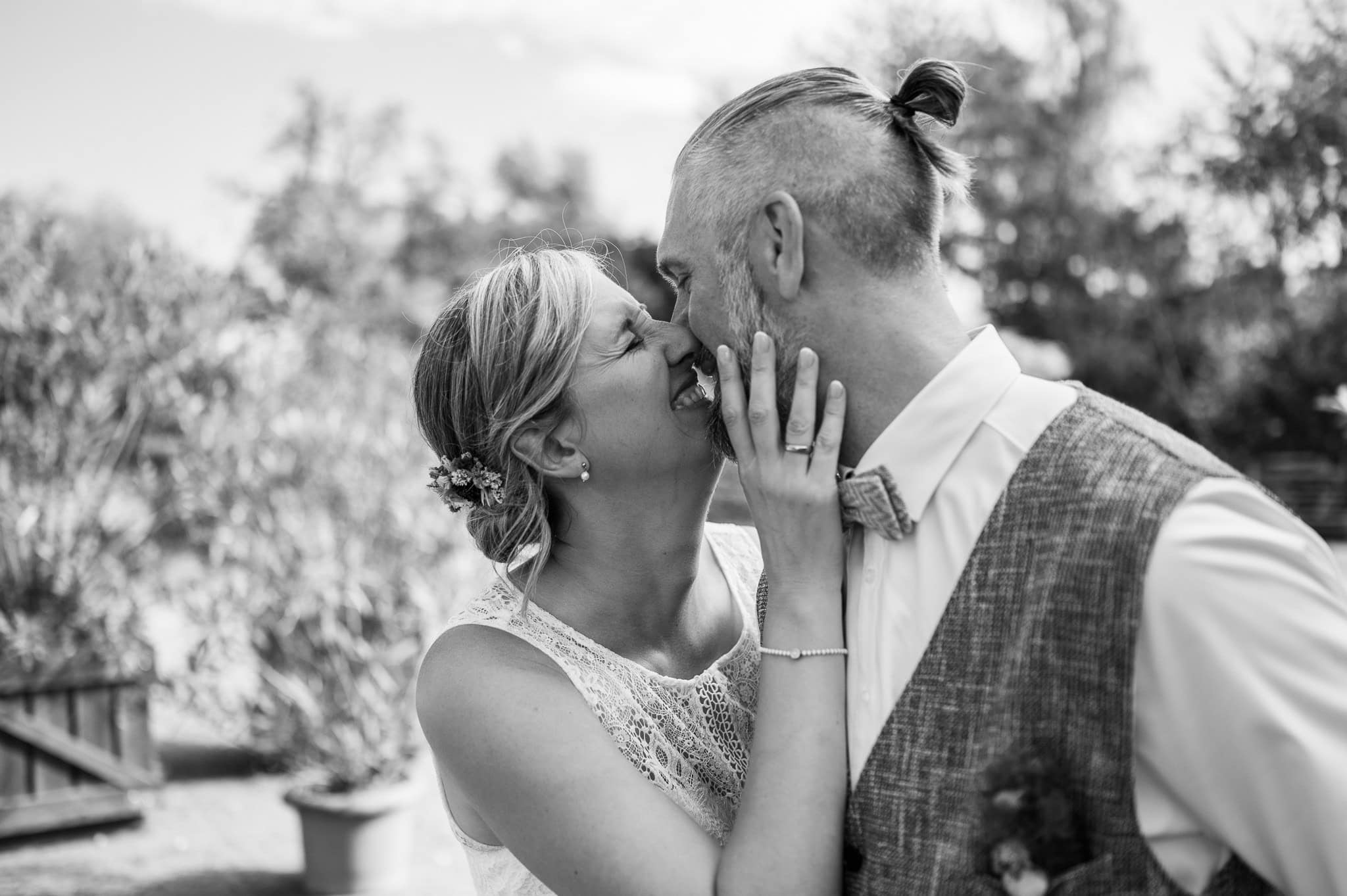 In den meisten Fällen bietet es sich vor Ort an die Hochzeitspaarfotos und Gruppenbilder zu machen. So ein schöner Hof, wie hier bietet oft viele verschieden Fotospots an, die für die Hochzeitsfotos super genutzt werden können. Vor Ort ergeben sich spontane Momente, die eingefangen werden können. Paarfotos entstehen oft natürlich im Ablauf des Tages. Kein Stress, keine langen Wege, kein Zeitdruck.