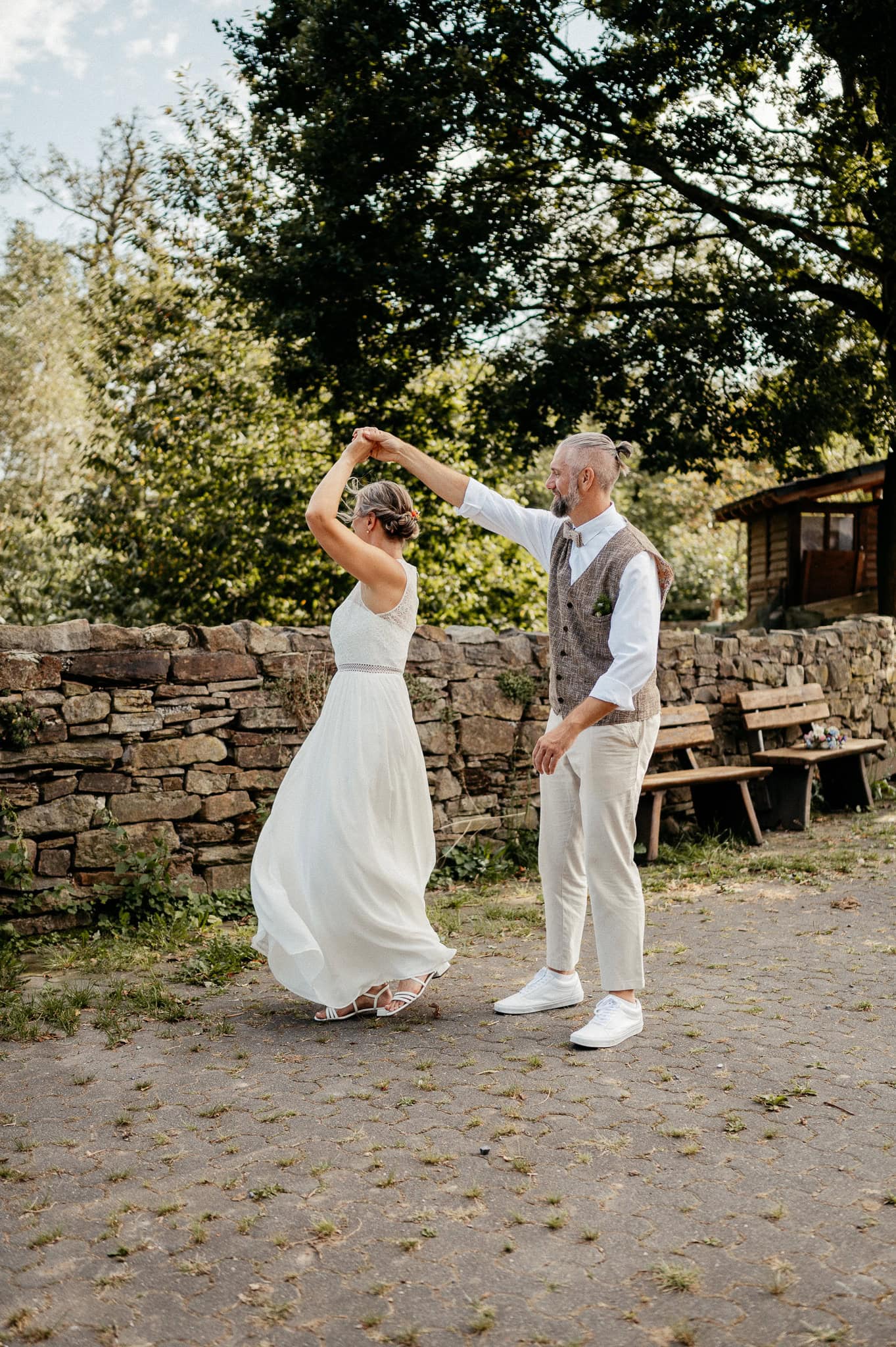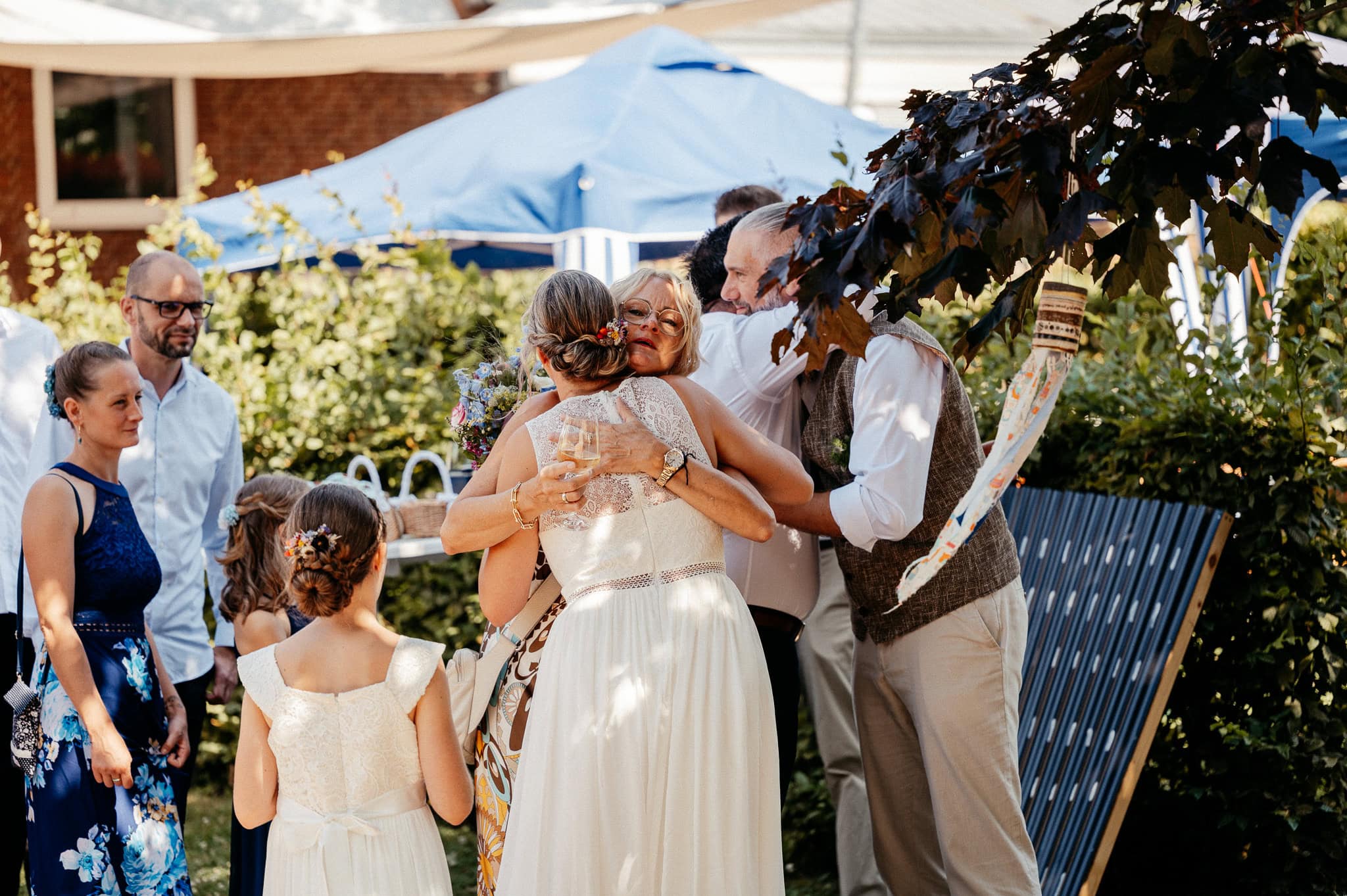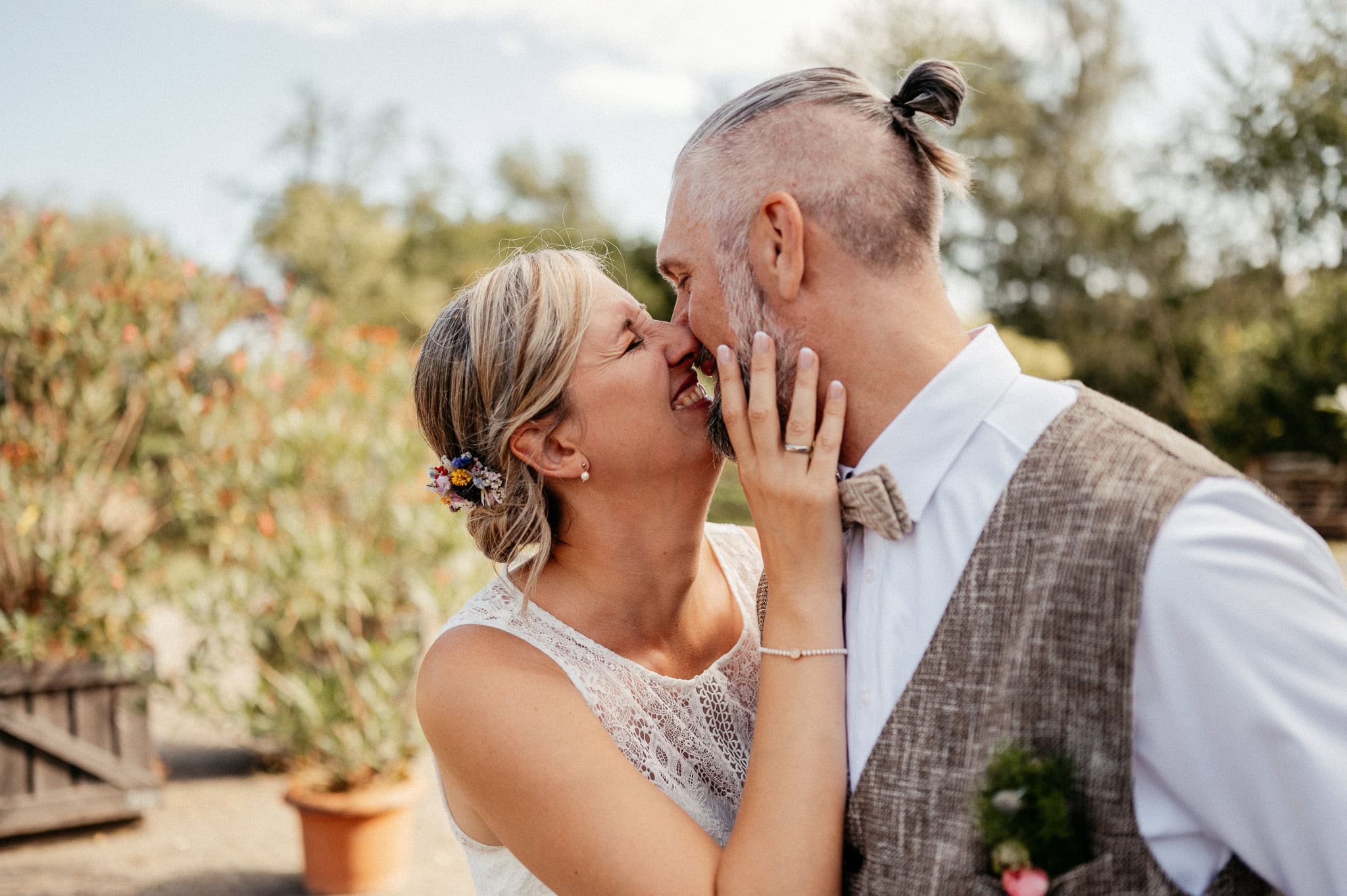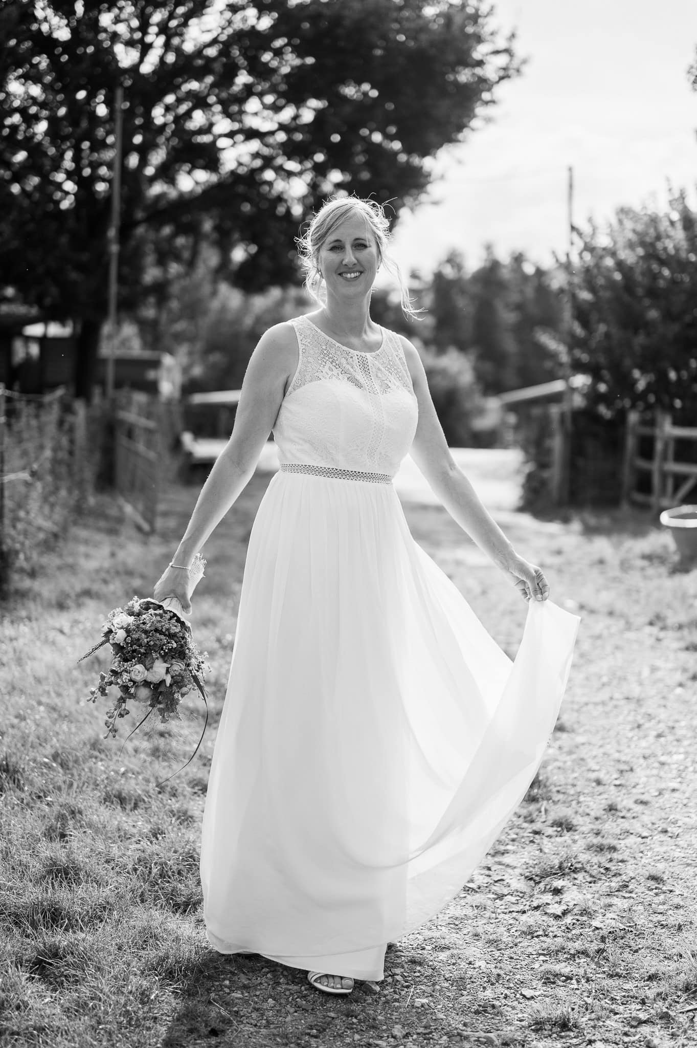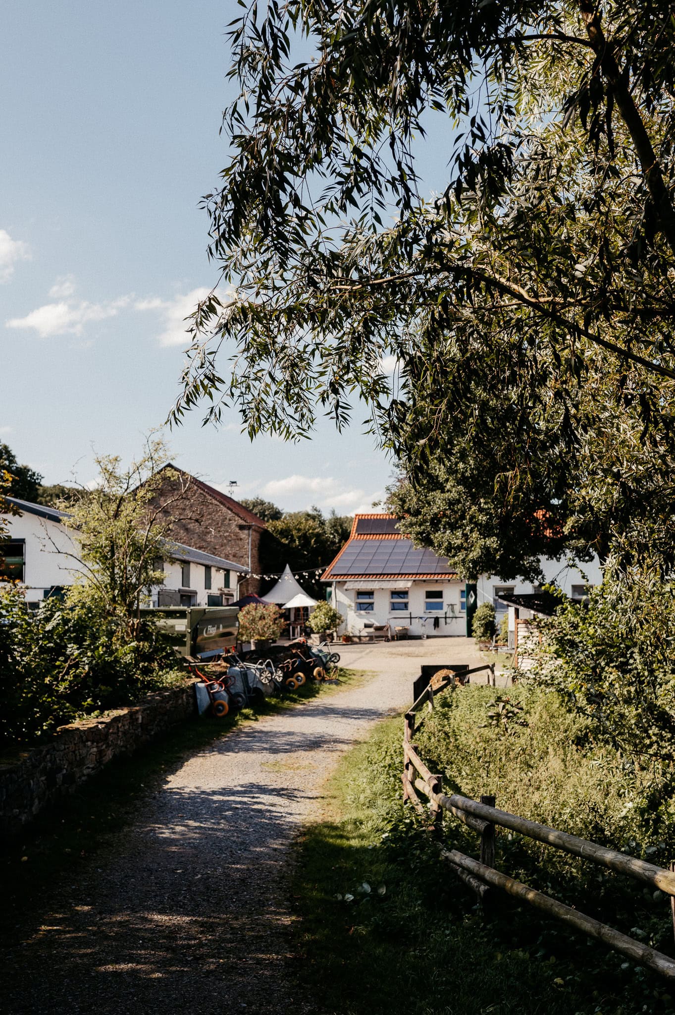 In den meisten Fällen bietet es sich vor Ort an die Hochzeitspaarfotos und Gruppenbilder zu machen. So ein schöner Hof, wie hier bietet oft viele verschieden Fotospots an, die für die Hochzeitsfotos super genutzt werden können. Vor Ort ergeben sich spontane Momente, die eingefangen werden können. Paarfotos entstehen oft natürlich im Ablauf des Tages. Kein Stress, keine langen Wege, kein Zeitdruck.