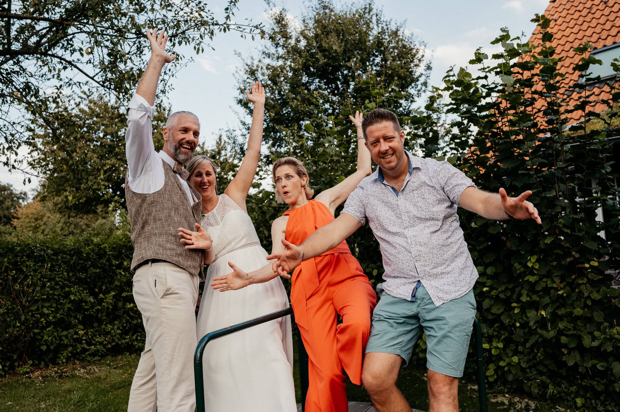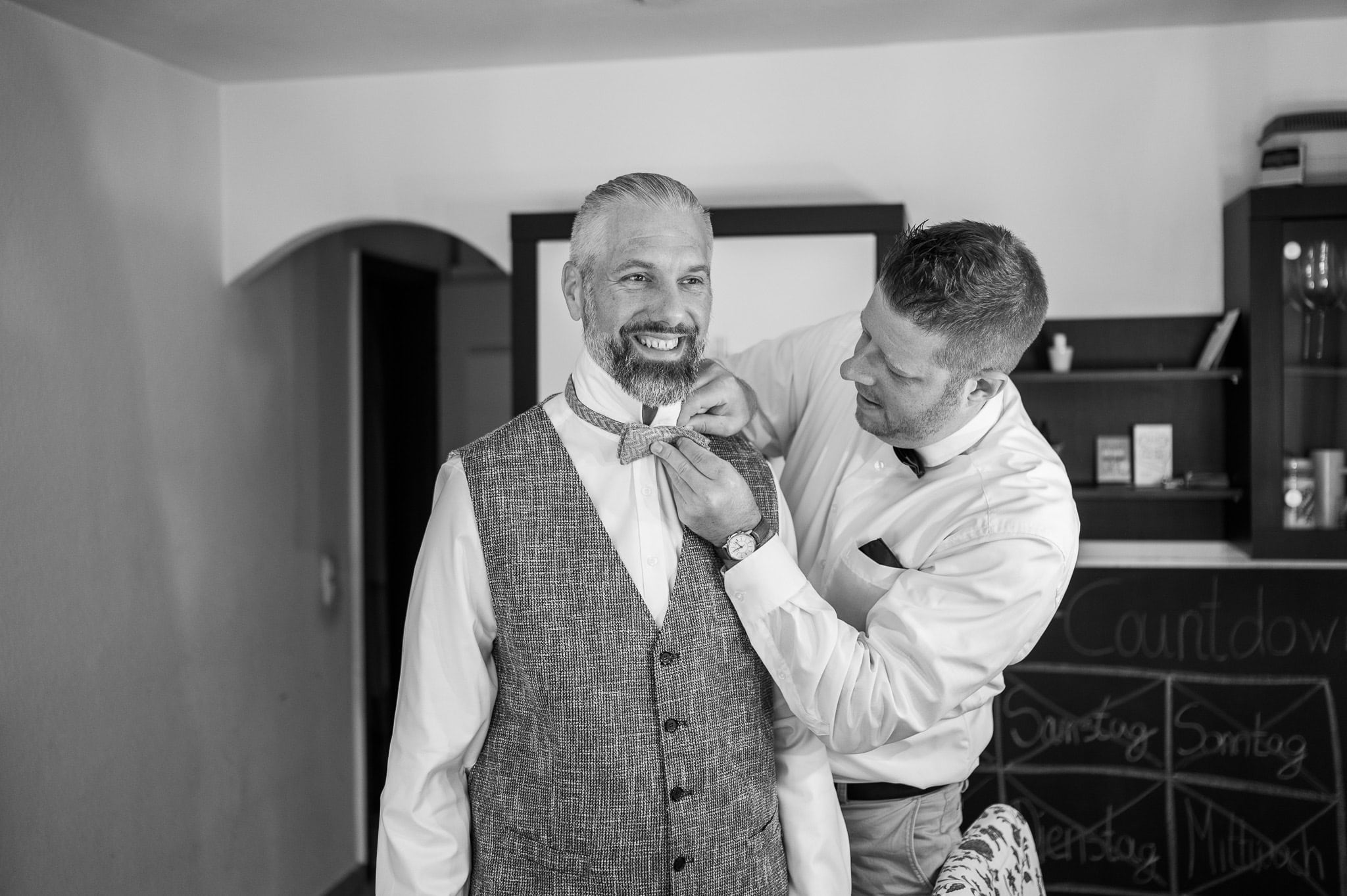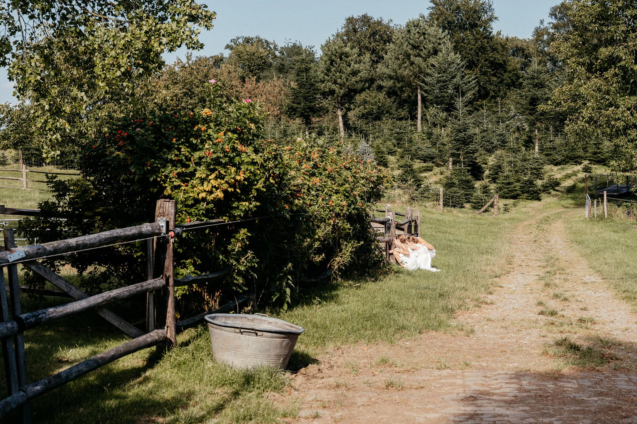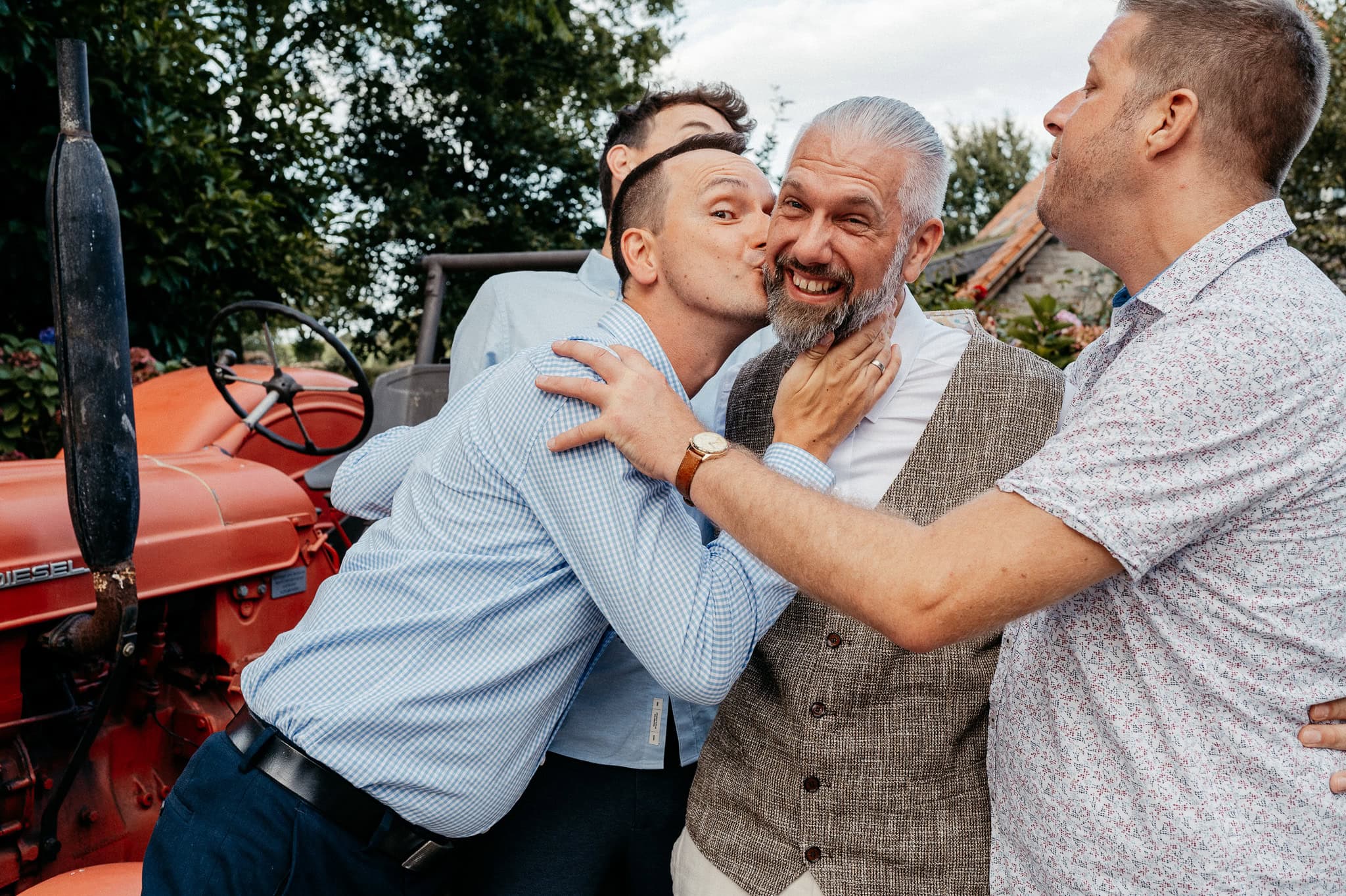 In den meisten Fällen bietet es sich vor Ort an die Hochzeitspaarfotos und Gruppenbilder zu machen. So ein schöner Hof, wie hier bietet oft viele verschieden Fotospots an, die für die Hochzeitsfotos super genutzt werden können. Vor Ort ergeben sich spontane Momente, die eingefangen werden können. Paarfotos entstehen oft natürlich im Ablauf des Tages. Kein Stress, keine langen Wege, kein Zeitdruck.