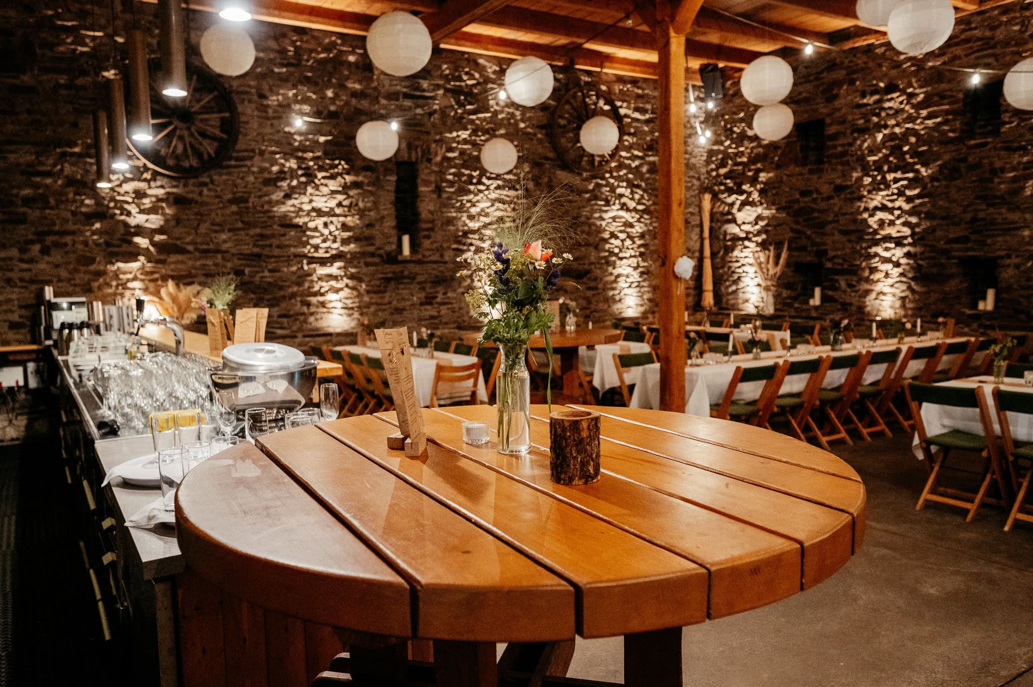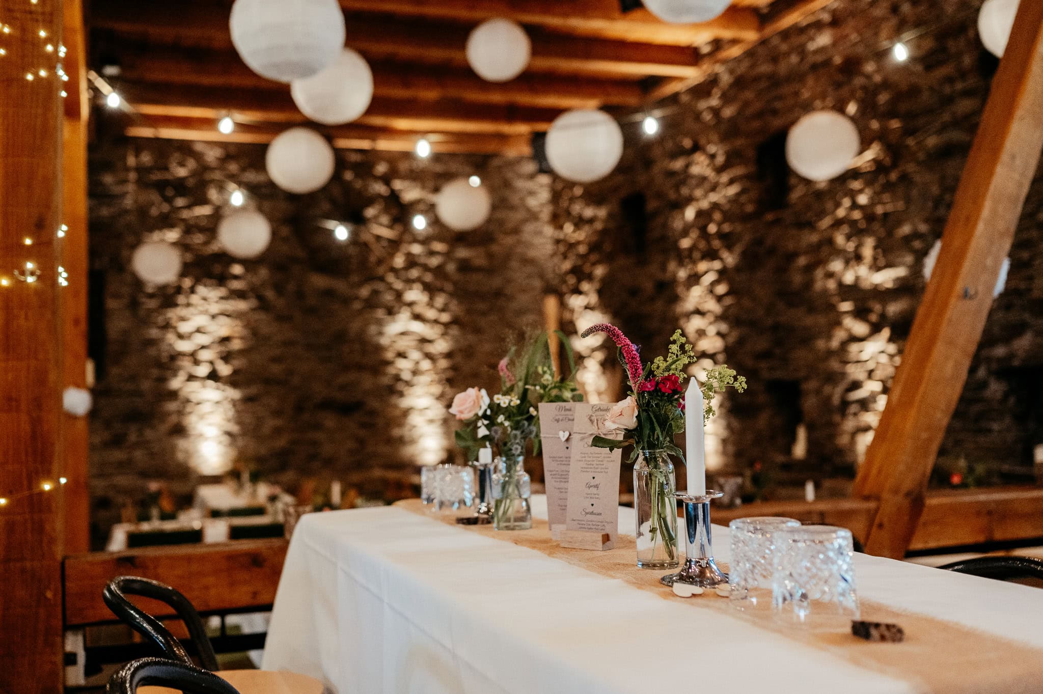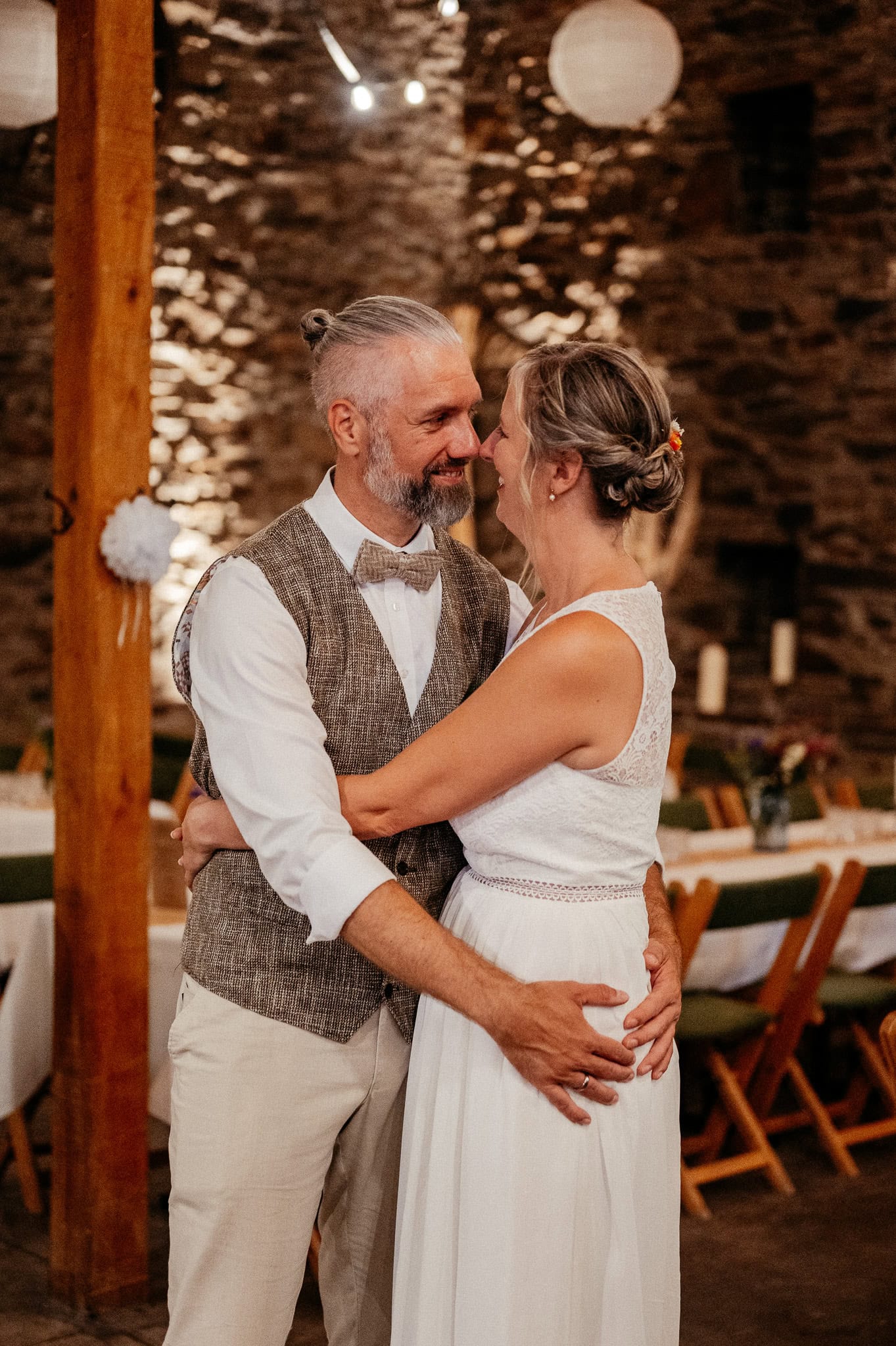 Wenn der Tag langsam in den Abend übergeht, verändert sich die Stimmung in der Scheune spürbar. Das Licht wird weicher, die Atmosphäre ruhiger und intimer. Diese Stimmung trägt die Bilder fast von selbst und sorgt für emotionale Aufnahmen, die Euren Hochzeitstag stimmungsvoll abrunden.
