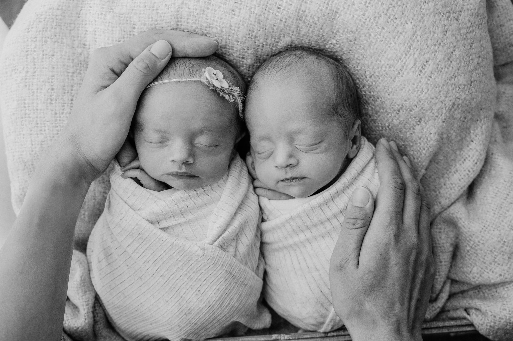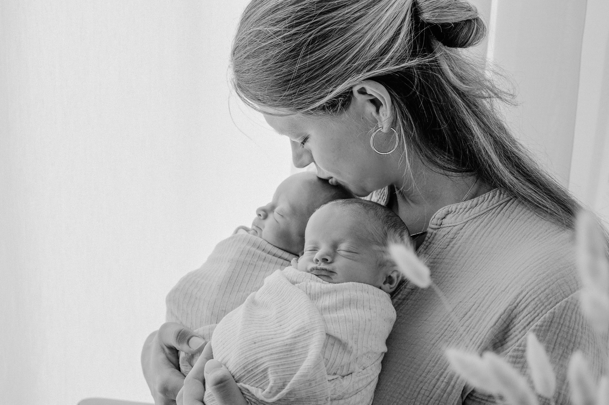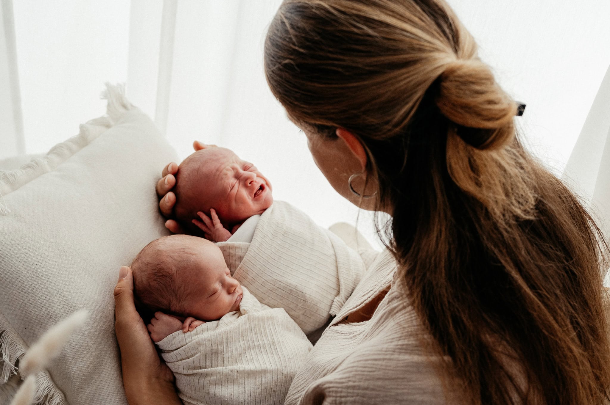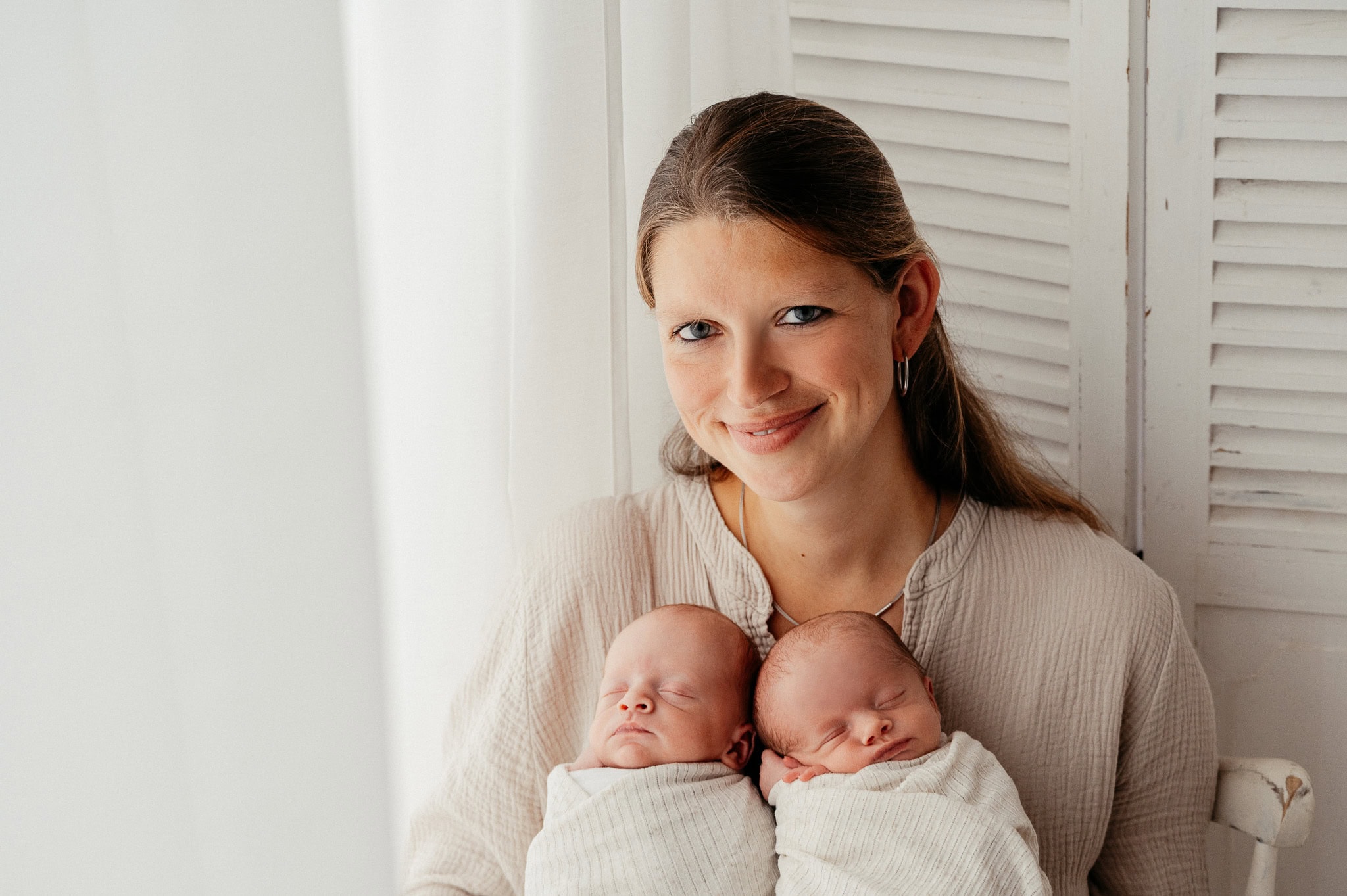 Nach einer kurzen Ankunftszeit, in der wir die Babys kennenlernen und alles vorbereiten, starten wir mit den ersten Motiven. Wir haben die beiden in verschiedenen Kombinationen fotografiert: gemeinsam als Duo, aber auch einzeln – und natürlich mit ihrer Mama. Gerade die Bilder mit Mama sind für uns immer besonders: so viel Liebe, so viel Stolz, so viel „Ankommen“. Oft merkt man erst auf dem Bild, wie klein die Babys wirklich sind – eingekuschelt in Mamas Arm. Und obwohl die Neugeborenen noch so winzig sind, ist es immer wieder eine Herausforderung für uns Fotografen die kleinen Menschen zu positionieren. Hast Du schon mal zwei Babys gleichzeitig festhalten müssen? Dabei hilft es enorm, wenn die Babys eingepuckt sind.
