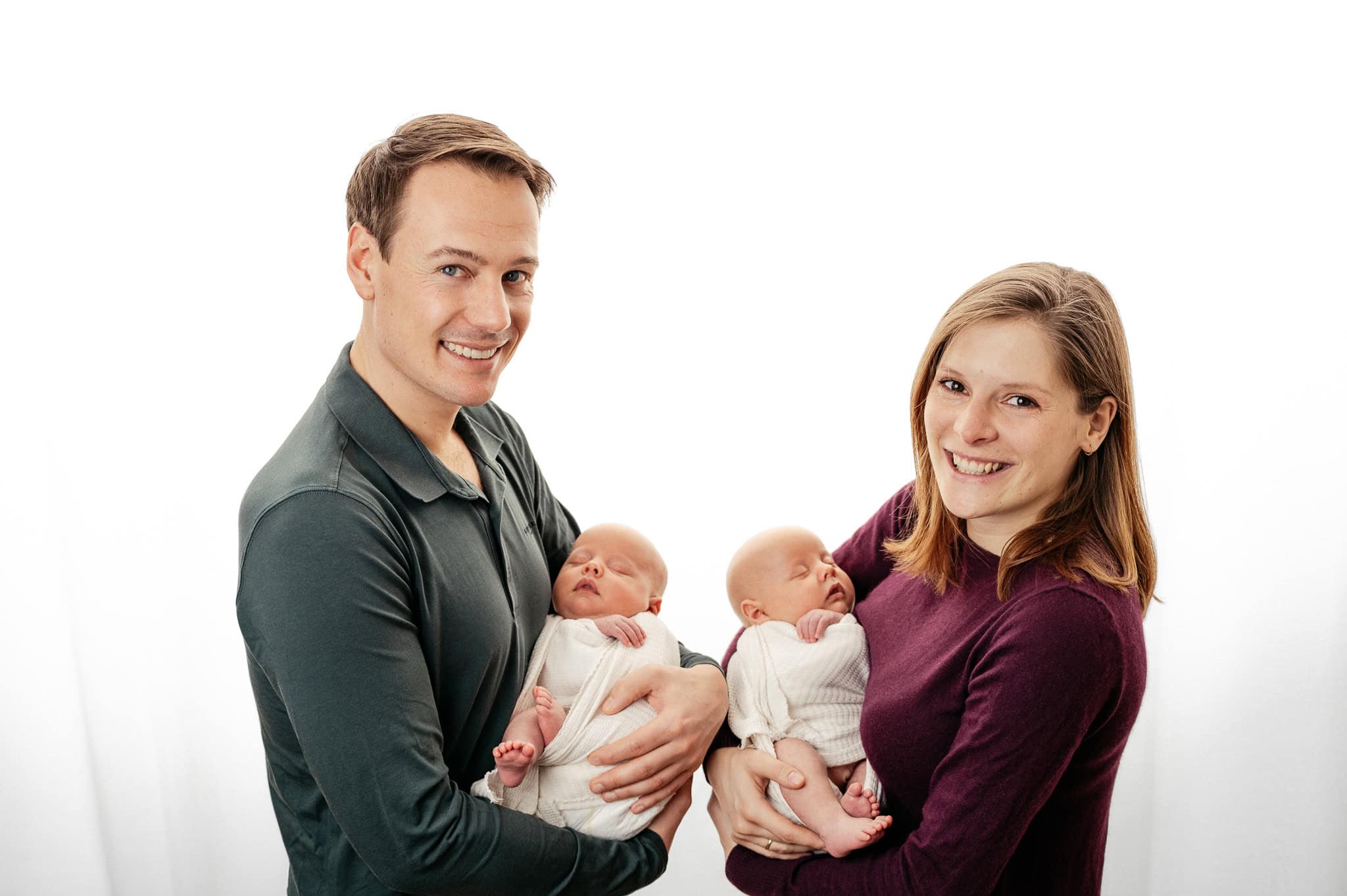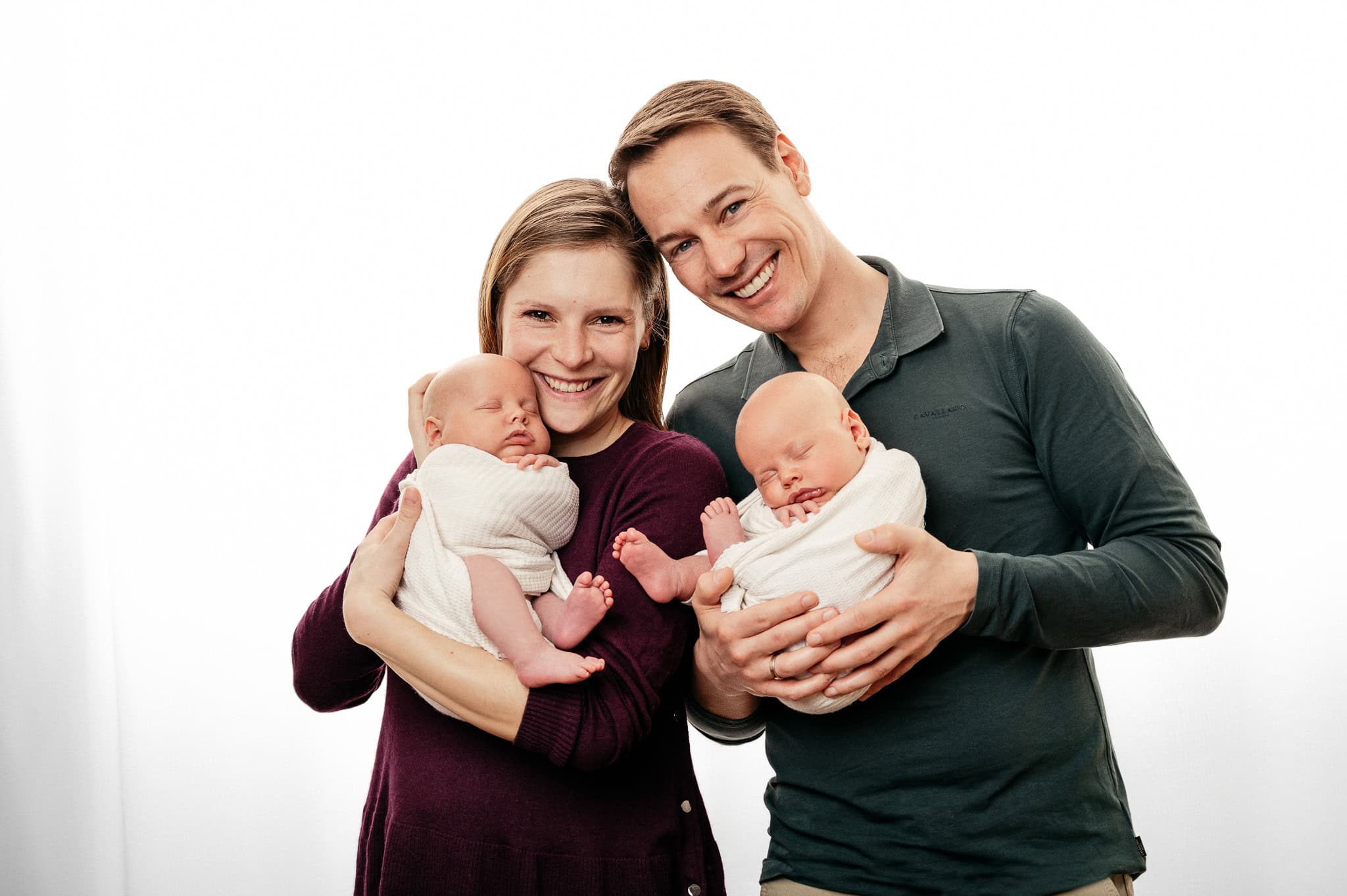 Diese ersten Familienfotos sind oft die emotionalsten Momente des ganzen Shootings. Wenn die Eltern ihre kleinen Wunder im Arm halten, spürt man plötzlich diese besondere, stille Magie im Raum. Zwei winzige Herzen, die Eure Welt für immer verändert haben – und Ihr mittendrin, voller Liebe, Dankbarkeit und einem Hauch von Chaos – ab jetzt heißt es: Double Trouble.